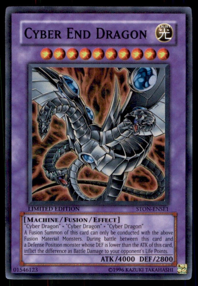 About Me Other Listings Feedback Add to Favorites Contact Me Bluenose Yu-Gi-Oh! Cyber End Dragon #STON-ENSE1 Light Play No stock photo / These are real scans or pictures Details Description: Cyber End Dragon Category: Yugioh Year: 1996 Product: Yu-Gi-Oh! Card Number: STON-ENSE1 Special: Light Play Dimensions: 3¼" x 2¼" SKU: YU B0003 R02 R (5) Payment Payment for buy it now is required immediately and for auctions it must be paid within 72 hours. Shipping Shipments usually make their way out in 3 business days. All orders to USA under 800$ USD typically are NOT subject to import or duty! We also offer free shipping on all our cards for north america. Returns and Claims Please view listing photo and description prior to purchase of card to make sure the card and condition is right for you! About Us Please keep in mind the following conditions .-------------------------------------------Near Mint: a card that shows very little to no signs of ware or usage such as very little whiting. -------------------------------------------Light Play: A card that shows signs of ware such as but not limited to whiting, slight bend or scratches. -------------------------------------------Heavy Play: A card that shows signs of ware, whiting, bending, creasing, folding or other various issues.-------------------------------------------Damaged: a card in very bad condition can have some or all of the above mentioned condition notes including peeling, stains, writing, etc.-------------------------------------------The photo in ads are the EXACT card you will recieve. Listing By Kronocard trading cards software v2.7.0.1