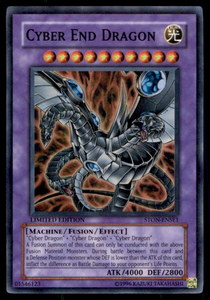 About Me Other Listings Feedback Add to Favorites Contact Me Bluenose Yu-Gi-Oh! Cyber End Dragon #STON-ENSE1 Light Play No stock photo / These are real scans or pictures Details Description: Cyber End Dragon Category: Yugioh Year: 1996 Product: Yu-Gi-Oh! Card Number: STON-ENSE1 Special: Light Play Dimensions: 3¼" x 2¼" SKU: YU B0003 R01 I (4) Payment Payment for buy it now is required immediately and for auctions it must be paid within 72 hours. Shipping Shipments usually make their way out in 3 business days. All orders to USA under 800$ USD typically are NOT subject to import or duty! We also offer free shipping on all our cards for north america. Returns and Claims Please view listing photo and description prior to purchase of card to make sure the card and condition is right for you! About Us Please keep in mind the following conditions .-------------------------------------------Near Mint: a card that shows very little to no signs of ware or usage such as very little whiting. -------------------------------------------Light Play: A card that shows signs of ware such as but not limited to whiting, slight bend or scratches. -------------------------------------------Heavy Play: A card that shows signs of ware, whiting, bending, creasing, folding or other various issues.-------------------------------------------Damaged: a card in very bad condition can have some or all of the above mentioned condition notes including peeling, stains, writing, etc.-------------------------------------------The photo in ads are the EXACT card you will recieve. Listing By Kronocard trading cards software v2.7.0.1