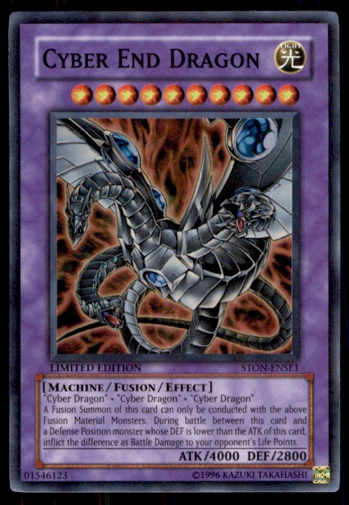 About Me Other Listings Feedback Add to Favorites Contact Me Bluenose Yu-Gi-Oh! Cyber End Dragon #STON-ENSE1 Light Play No stock photo / These are real scans or pictures Details Description: Cyber End Dragon Category: Yugioh Year: 1996 Product: Yu-Gi-Oh! Card Number: STON-ENSE1 Special: Light Play Dimensions: 3¼" x 2¼" SKU: YU B0003 R01 J (12) Payment Payment for buy it now is required immediately and for auctions it must be paid within 72 hours. Shipping Shipments usually make their way out in 3 business days. All orders to USA under 800$ USD typically are NOT subject to import or duty! We also offer free shipping on all our cards for north america. Returns and Claims Please view listing photo and description prior to purchase of card to make sure the card and condition is right for you! About Us Please keep in mind the following conditions .-------------------------------------------Near Mint: a card that shows very little to no signs of ware or usage such as very little whiting. -------------------------------------------Light Play: A card that shows signs of ware such as but not limited to whiting, slight bend or scratches. -------------------------------------------Heavy Play: A card that shows signs of ware, whiting, bending, creasing, folding or other various issues.-------------------------------------------Damaged: a card in very bad condition can have some or all of the above mentioned condition notes including peeling, stains, writing, etc.-------------------------------------------The photo in ads are the EXACT card you will recieve. Listing By Kronocard trading cards software v2.7.0.1