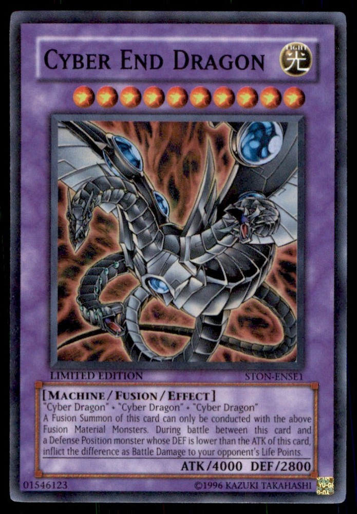 About Me Other Listings Feedback Add to Favorites Contact Me Bluenose Yu-Gi-Oh! Cyber End Dragon #STON-ENSE1 Light Play No stock photo / These are real scans or pictures Details Description: Cyber End Dragon Category: Yugioh Year: 1996 Product: Yu-Gi-Oh! Card Number: STON-ENSE1 Special: Light Play Dimensions: 3¼" x 2¼" SKU: YU B0003 R04 U (31) Payment Payment for buy it now is required immediately and for auctions it must be paid within 72 hours. Shipping Shipments usually make their way out in 3 business days. All orders to USA under 800$ USD typically are NOT subject to import or duty! We also offer free shipping on all our cards for north america. Returns and Claims Please view listing photo and description prior to purchase of card to make sure the card and condition is right for you! About Us Please keep in mind the following conditions .-------------------------------------------Near Mint: a card that shows very little to no signs of ware or usage such as very little whiting. -------------------------------------------Light Play: A card that shows signs of ware such as but not limited to whiting, slight bend or scratches. -------------------------------------------Heavy Play: A card that shows signs of ware, whiting, bending, creasing, folding or other various issues.-------------------------------------------Damaged: a card in very bad condition can have some or all of the above mentioned condition notes including peeling, stains, writing, etc.-------------------------------------------The photo in ads are the EXACT card you will recieve. Listing By Kronocard trading cards software v2.7.0.1
