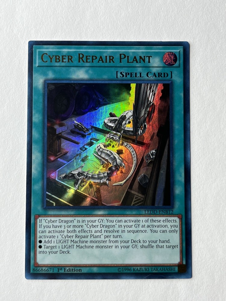 This is a rare Yu-Gi-Oh! TCG card from the Legendary Dragon Decks set. The Cyber Repair Plant card has a holographic finish and is in near-mint condition. The card is an ultra rare 1st edition Spell card with the card number LEDD-ENB12. It was manufactured by Konami and is in English language. This is a great addition to any collector's CCG individual cards collection. Comes with a protective sleeve.