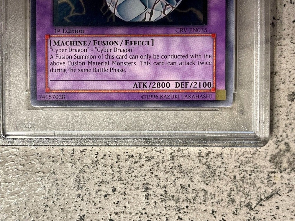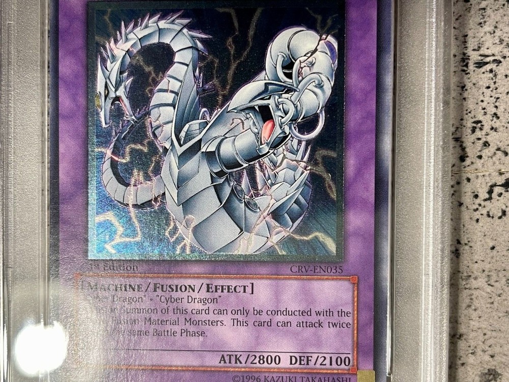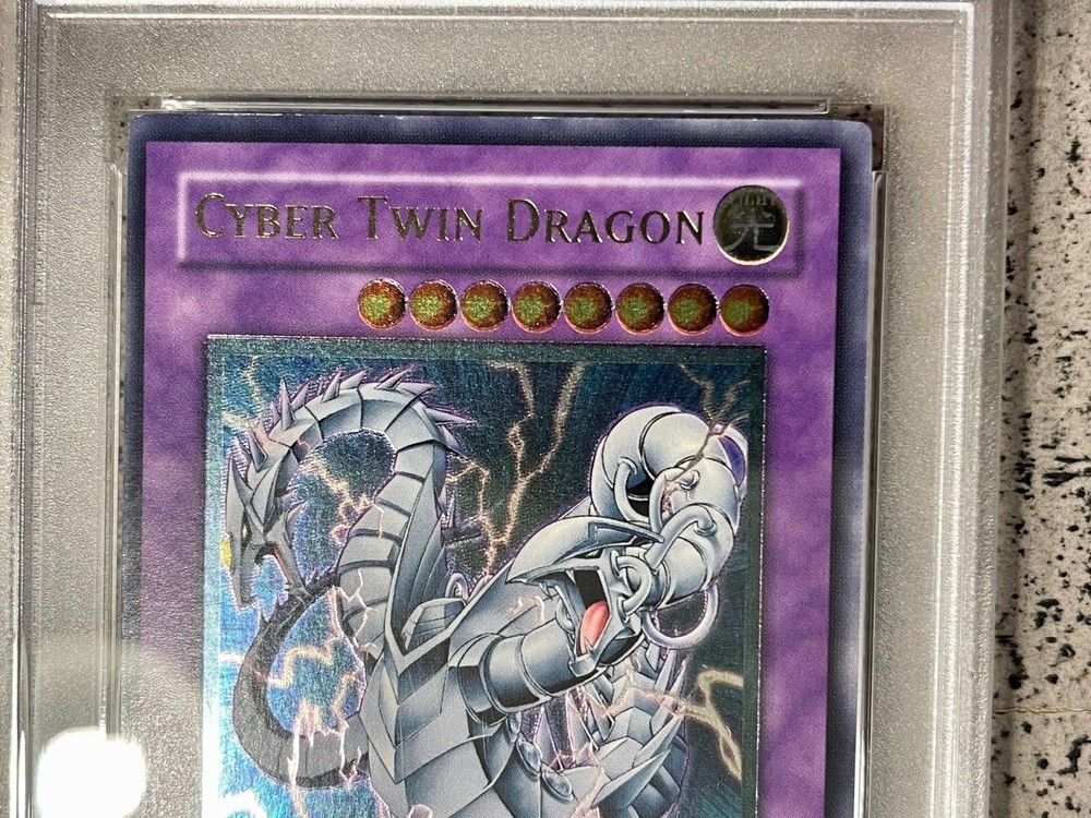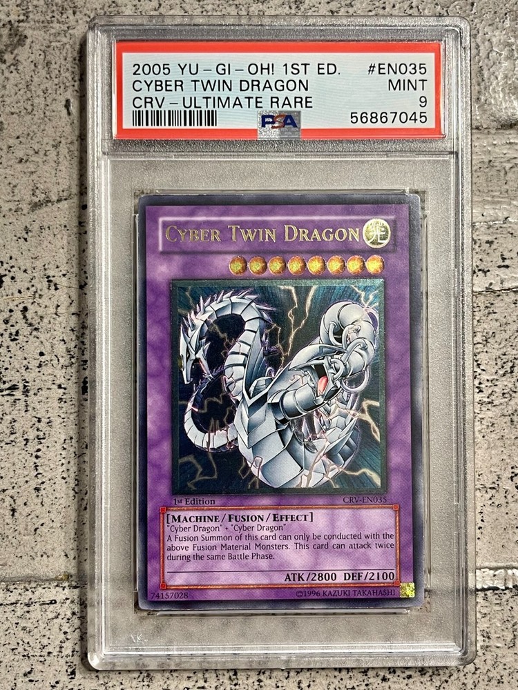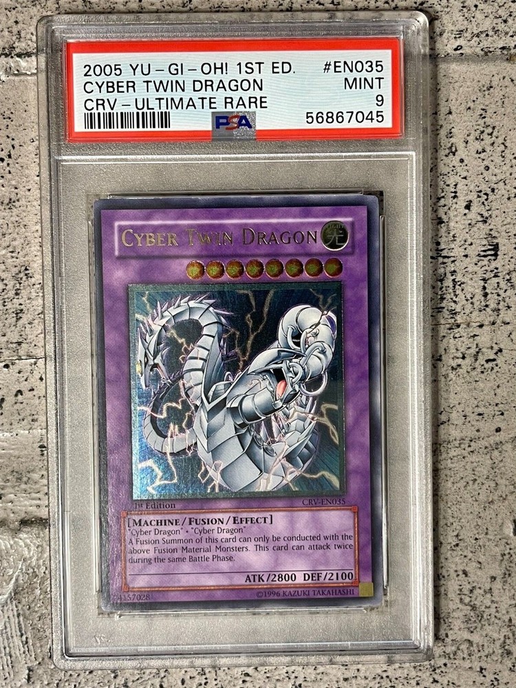 View My Feedback Click Here Visit My About Me Page Click Here Visit Ebay My World Click Here BUY WITH 100% CONFIDENCE! Yu-Gi-Oh! Cyber Twin Dragon Ultimate Rare CRV-EN035 PSA 9 Details: This is for (1) Cyber Twin Dragon CRV-EN035 PSA 9 The Card in the Pictures is the exact one you will be getting (see pics). I am not a Professional Grader nor am I responsible for the grade of the card (make sure to look at pics before buying the item). Includes: (1) Cyber Twin Dragon 1st Ed. CRV-EN035 PSA 9 Ultimate Rare Condition: Used (See pictures) PSA Plastic Slab BUY IT NOW for only: $488.88 AUCTION DETAILS: Shipping and Handling will be Expedited Shipping (Priority Mail or First Class) Delivery Confirmation Included. (US only) International Shipping Available. We only ship to verified confirmed PayPal addresses. International Buyers? Please Note: Import duties, taxes, and charges are not included in the item price or shipping cost. These charges are the buyer's responsibility. Please check with your country's customs office to determine what these additional costs will be prior to bidding or buying. PAYMENT : We accept PayPal. Payment must be received within 24 hours of auction end. If not received, item will be relisted. Buyer will also be reported to ebay. Items will be shipped within 24-48 hours of payment received via Ebay/PayPal. RETURNS: If you are not completely satisfied with the item, then please contact us with any issues you may have. We try our best to describe every item as accurate as possible, but sometimes things do get missed. We will work with you to make sure every transaction is a pleasant one. No returns on electronics. All electronics sold as is. Refund or exchange will be given if there was a mistake made or item not as described. Please Note: eBay fees and shipping and handling costs are Not refundable. FEEDBACK: Please leave feedback once you receive your item(s) so we know you received your item(s). We will leave feedback afterwards. PLEASE Contact Seller before leaving neutral or negative feedback for items lost or damaged during shipping. Please give us an opportunity to resolve the matter to your satisfaction. We DO NOT want you to be an unhappy with your purchase. QUESTIONS If you have a question or concern, I'm more than happy to help make sure you are satisfied with the item you paid for. I do my best to help and try to answer all emails received within 24 hours.