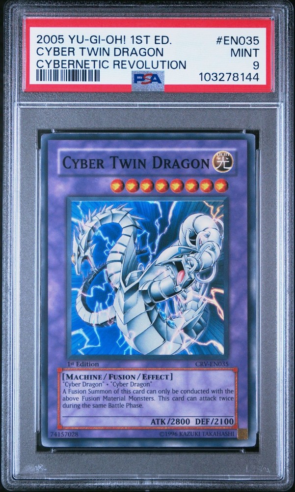 Yu-Gi-Oh! - Cyber Twin Dragon 2005 CRV-EN035 1st Edition PSA 9 Yu-Gi-Oh! - Cyber Twin Dragon 2005 CRV-EN035 1st Edition PSA 9 Yu-Gi-Oh! - Cybernetic Revolution Cyber Twin Dragon 2005 CRV-EN035 1st Edition PSA 9 Details Set: Cybernetic Revolution Card: Cyber Twin Dragon Number: CRV-EN035 Manufacturer: Yu-Gi-Oh! Year: 2005 Variation: 1st Edition Graded: PSA 9 Notes: Images on listing are scans of actual card you will receive, please use photos to determine condition. Card will be stored and shipped in a protective toploader. We sell collectible merchandise, with conditions ranging from used, vintage to brand new. We do our best to accurately describe the features and condition of each item. Due to the nature of these products, the item and/or original packaging may have handling wear, aging, etc. Please carefully review the description and photos to evaluate the condition of the item to ensure it meets your expectations prior to purchase. We do not use stock images , each photo on this listing is of the actual item for sale. We do offer combined shipping for multiple items going to the same address. Of course, feel free to ask us any questions you may have! Thank you for shopping with us. Please visit our eBay store to check out our other collectible items! Welcome Shipping Returns Thanks for stopping by our store! We appreciate the opportunity to earn your positive feedback and share our unique collection with you! If you have any concerns, please contact us immediately so we can assist you. We are very responsive and happy to assist. Here at Back in the Day, we are pleased to share our collection of vintage and modern collectibles with you. From classic movie, music and gaming memorabilia to pop culture toys and so much more, take home a piece of nostalgia from our ever-changing stockroom. Be sure to browse all our categories frequently so you don't miss out on that rare find! Shipping Speed We are proud to provide fast service to our customers; your order will be shipped within 1 business day of placing your order. On average, domestic First Class/Ground Advantage packages arrive in 5-7 business days (depending on destination). On average, domestic Priority packages arrive in 3-5 business days (depending on destination). On average, FedEx Ground/Home packages arrive in 2-6 business days. We observe all government holidays. We cannot guarantee delivery dates. Packaging We take care in packaging each order - you can rest assured that your items will be thoughtfully packaged to minimize risk and arrive safely to you. Combined Shipping We're happy to combine shipping for multiple items going to the same address.* Multiple items should auto-combine in your cart, but if not, you can request an invoice with combined shipping. We will choose the lowest cost shipping option during fulfillment meeting all carrier weight and policy requirements. *We are unable to combine shipping on auction orders for separate auctions (auctions ending on different dates). Orders must be paid within four days from auction end, or will be cancelled. Additional Once we ship your order, we will provide you tracking information. If you do not receive your shipment within 11 business days of placing your order, feel free to contact us and we’ll be happy to investigate it further. If an item is returned to us due to an incorrect or incomplete address entered during purchase, the buyer is responsible for paying shipping cost if they want the item resent. If the item will not be resent, the buyer will be issued a refund for the cost of the item, not the cost of shipping paid. Please review your shipping details to ensure successful delivery. Please also note that the shipping rates for items we sell are weight-based. We will choose the most cost-efficient delivery method for your order based on weight and size. To reflect the policies of the shipping companies we use, all weights will be rounded up to the nearest pound or ounce, depending on the carrier requirements. We are always available if you have questions! We value your business. Just let us know what you need help with and we will respond quickly. If an item is damaged in shipping, we will be happy to help. Please contact us with your order number and details, including pictures of the damaged item within 30 days of purchase. Due to the nature of the products we sell, and the fact that many are vintage and not new merchandise, items are not eligible for return without reasonable cause. Please take care in reviewing product descriptions and photos before placing your order to be fully aware of the condition of the item. Feel free to ask any questions you may have about an item and we will respond as soon as possible.