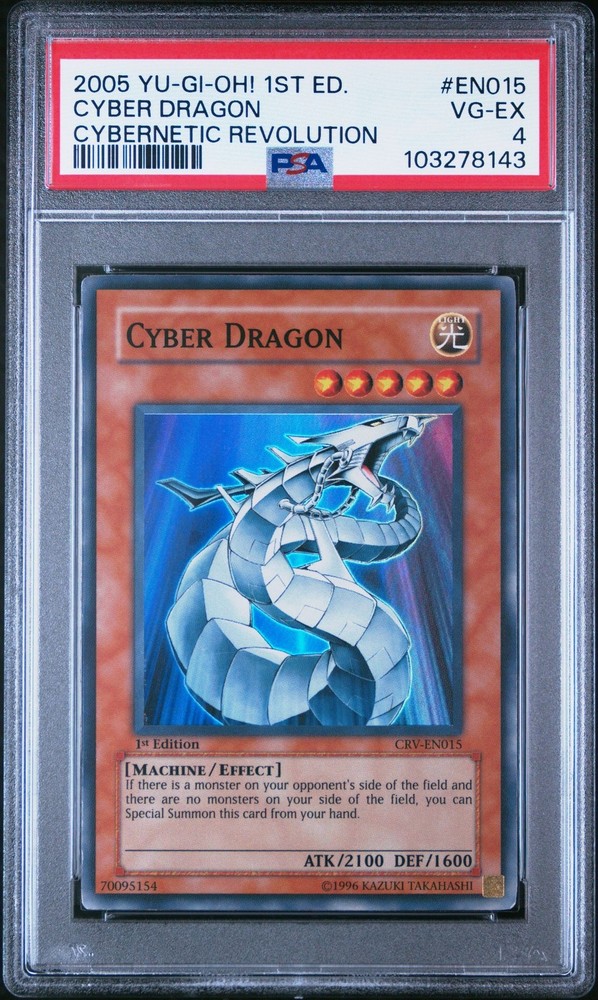 Yu-Gi-Oh! - Cybernetic Revolution Cyber Dragon 2005 CRV-EN015 1st Edition PSA 4 Yu-Gi-Oh! - Cybernetic Revolution Cyber Dragon 2005 CRV-EN015 1st Edition PSA 4 Yu-Gi-Oh! - Cybernetic Revolution Cyber Dragon 2005 CRV-EN015 1st Edition PSA 4 Details Set: Cybernetic Revolution Card: Cyber Dragon Number: CRV-EN015 Manufacturer: Yu-Gi-Oh! Year: 2005 Variation: 1st Edition Graded: PSA 4 Notes: Images on listing are scans of actual card you will receive, please use photos to determine condition. Card will be stored and shipped in a protective toploader. We sell collectible merchandise, with conditions ranging from used, vintage to brand new. We do our best to accurately describe the features and condition of each item. Due to the nature of these products, the item and/or original packaging may have handling wear, aging, etc. Please carefully review the description and photos to evaluate the condition of the item to ensure it meets your expectations prior to purchase. We do not use stock images , each photo on this listing is of the actual item for sale. We do offer combined shipping for multiple items going to the same address. Of course, feel free to ask us any questions you may have! Thank you for shopping with us. Please visit our eBay store to check out our other collectible items! Welcome Shipping Returns Thanks for stopping by our store! We appreciate the opportunity to earn your positive feedback and share our unique collection with you! If you have any concerns, please contact us immediately so we can assist you. We are very responsive and happy to assist. Here at Back in the Day, we are pleased to share our collection of vintage and modern collectibles with you. From classic movie, music and gaming memorabilia to pop culture toys and so much more, take home a piece of nostalgia from our ever-changing stockroom. Be sure to browse all our categories frequently so you don't miss out on that rare find! Shipping Speed We are proud to provide fast service to our customers; your order will be shipped within 1 business day of placing your order. On average, domestic First Class/Ground Advantage packages arrive in 5-7 business days (depending on destination). On average, domestic Priority packages arrive in 3-5 business days (depending on destination). On average, FedEx Ground/Home packages arrive in 2-6 business days. We observe all government holidays. We cannot guarantee delivery dates. Packaging We take care in packaging each order - you can rest assured that your items will be thoughtfully packaged to minimize risk and arrive safely to you. Combined Shipping We're happy to combine shipping for multiple items going to the same address.* Multiple items should auto-combine in your cart, but if not, you can request an invoice with combined shipping. We will choose the lowest cost shipping option during fulfillment meeting all carrier weight and policy requirements. *We are unable to combine shipping on auction orders for separate auctions (auctions ending on different dates). Orders must be paid within four days from auction end, or will be cancelled. Additional Once we ship your order, we will provide you tracking information. If you do not receive your shipment within 11 business days of placing your order, feel free to contact us and we’ll be happy to investigate it further. If an item is returned to us due to an incorrect or incomplete address entered during purchase, the buyer is responsible for paying shipping cost if they want the item resent. If the item will not be resent, the buyer will be issued a refund for the cost of the item, not the cost of shipping paid. Please review your shipping details to ensure successful delivery. Please also note that the shipping rates for items we sell are weight-based. We will choose the most cost-efficient delivery method for your order based on weight and size. To reflect the policies of the shipping companies we use, all weights will be rounded up to the nearest pound or ounce, depending on the carrier requirements. We are always available if you have questions! We value your business. Just let us know what you need help with and we will respond quickly. If an item is damaged in shipping, we will be happy to help. Please contact us with your order number and details, including pictures of the damaged item within 30 days of purchase. Due to the nature of the products we sell, and the fact that many are vintage and not new merchandise, items are not eligible for return without reasonable cause. Please take care in reviewing product descriptions and photos before placing your order to be fully aware of the condition of the item. Feel free to ask any questions you may have about an item and we will respond as soon as possible.
