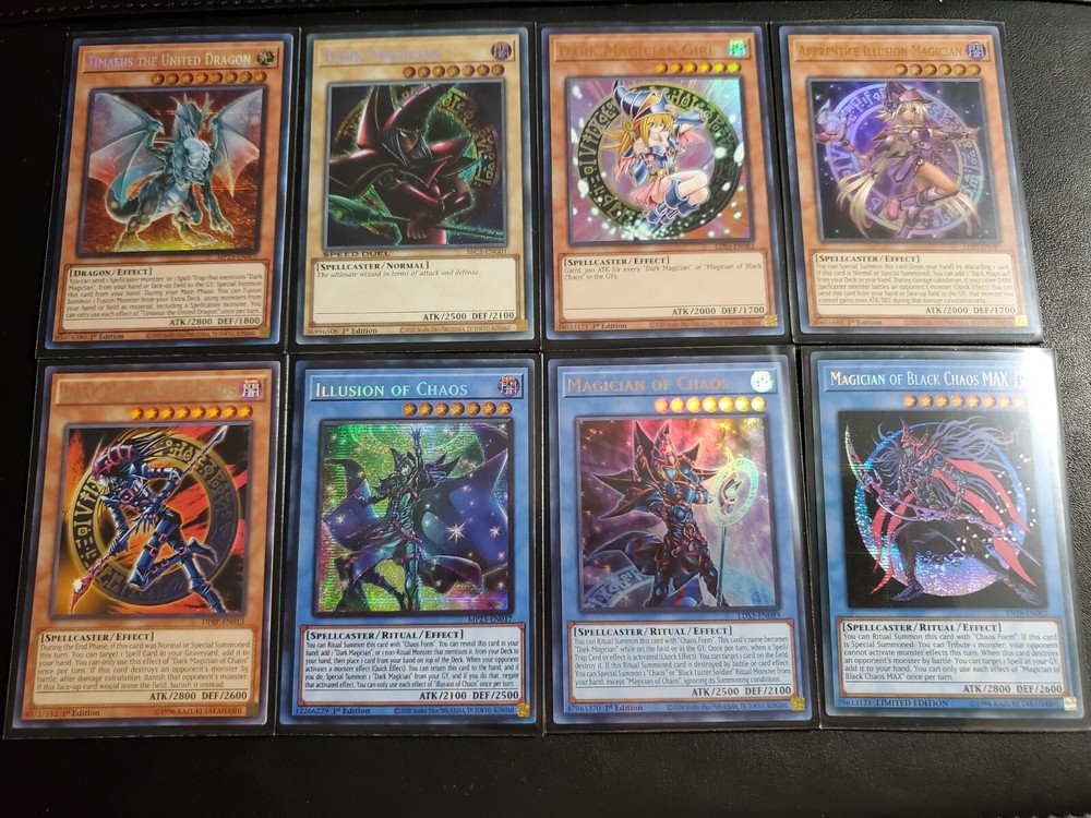 DESCRIPTION Yu-Gi-Oh! Dark Magician Deck Collection Monsters 1x Dark Magician (ultra rare) 1x Dark Magician arcana (ultra rare) 1x Magician Of Black Chaos Max (secret rare) 1x Illusion Of Chaos (secret rare) 1x Magician of Chaos (ultra rare) 1x Timaeus The United Dragon (secret rare) 1x Slyfer The Sky Dragon (secret rare) 1x Apprentice Illusion Magician (ultra rare) 1x Dark Magician Of Chaos (rare) 1x Dark Magician Girl (ultra rare) 1x Magician's Robe 1x Magician Of Dark Illusion 1x Magician's Rod 1x Skilled White Magician 1x Buster Blader 1x Skilled Dark Magician SPELL 1x Dark Magician Circle (ultra rare) 1x Exchage (secret rare) 1x Dark Magic Curtain (secret rare) 1x Dark Magic Attack 1x Chaos Form 1x Mystic Box 1x Infinite Cards 1x Swords Of Revealing Light 1x Magical Dimension 1x Anti-Magic Arrows 1x Polymerization 1x Monster reborn 1x Secrets Of Dark Magic 1x illusion magic 1x Thousand Knives 1x Black Magic Ritual TRAP 1x Dark Renewal (secret rare) 1x Magicians' Combination (ultra rare) 1x Magical Cylinders (super rare) 1x Magical Hats 1x Mirror Force 1x Dust Tornado 1x Spellbinding Circle 1x Magician Navigation 1x Magician's Circle 1x Lightforce Sword 1x Magic cylinder EXTRA 1x Master Of Chaos (secret rare) 1x Dark Magician The Knight of Dragon Magic (secret rare) 1x Dark Magician The Dragon Knight (ultra rare) 1x Dark Paladin 1x Ebon Illusion Magician (ultra rare) 1x Ebon High Magician You will receive every card that pictures show! bid with confidence. **Sleeves not Included** SHIPPING We ship up to 3 day after payment, except for holidays and weekend or when the delivery service is not available. FOR UNITED STATES CUSTOMERS: We use First Class for all kind of shipments, this include tracking number and the estimated delivery day is between 3 to 5 days, If you need a faster service send us a Message and we will help you to choose it. FOR INTERNATIONAL CUSTOMERS (outside united states): International shipping prices differ for each country and are calculated automatically by eBay. Tracking information is not available for international buyers beside Canada, once the package leave the US, the buyer have complete responsibility for that shipping. All duties and taxes are the responsibility of the buyer. They are not included in the listed price. Please check with your domestic customs office to determine what your additional costs will be prior to bidding. If you need to combine shipping please send us a message to help you.
