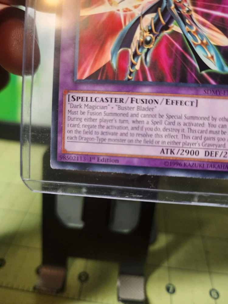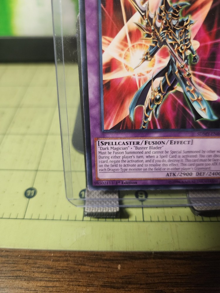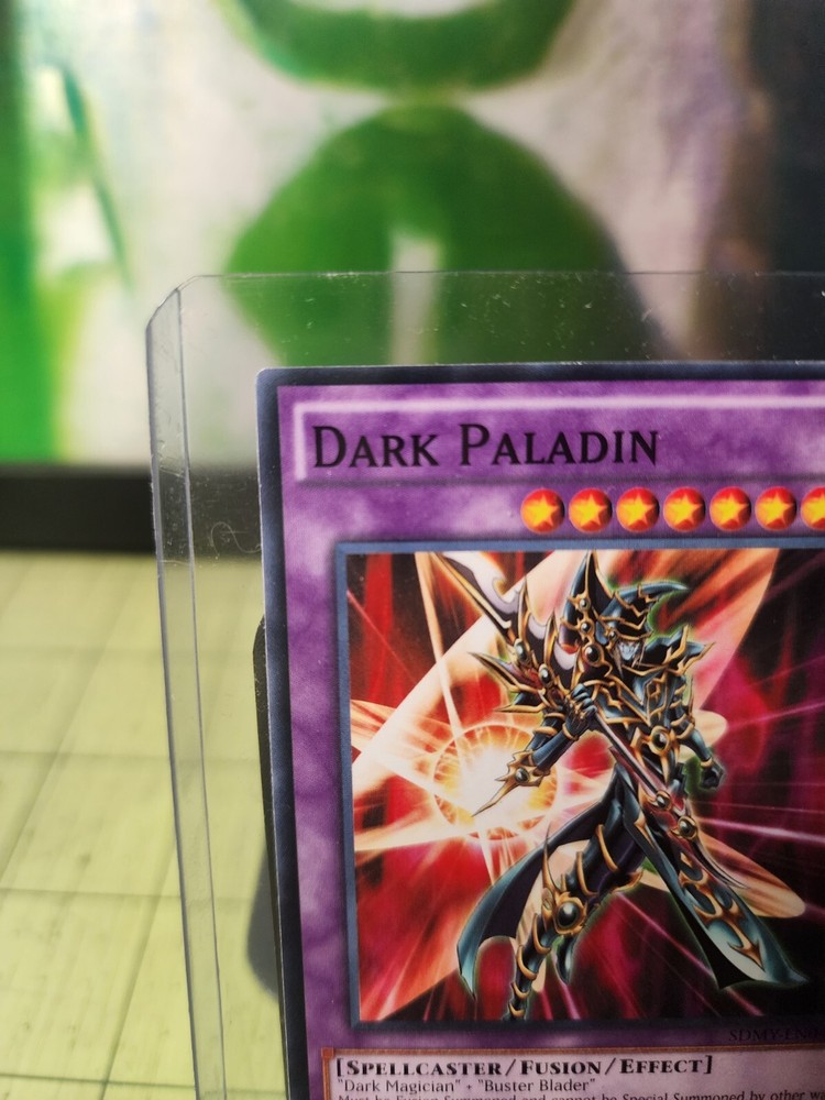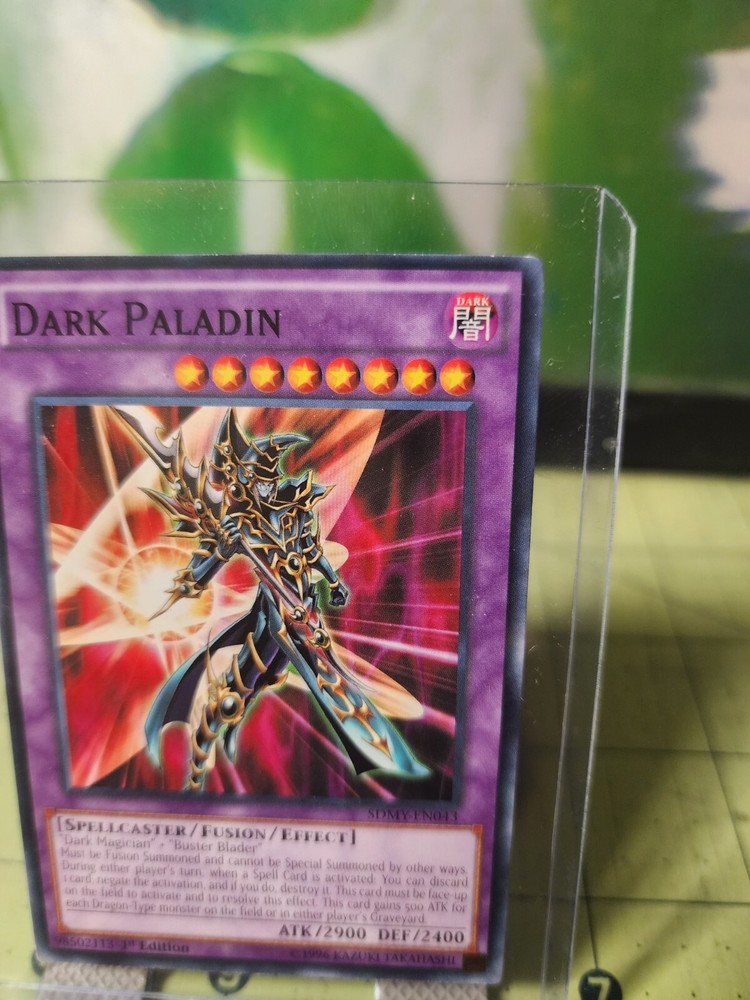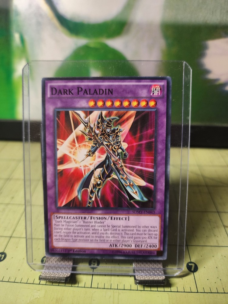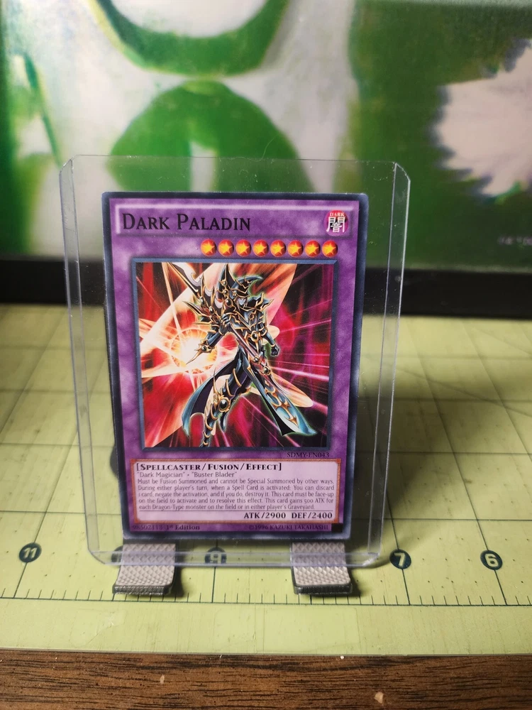 This Yu-Gi-Oh! TCG card features the Dark Paladin character, a Spellcaster creature type fusion card. It is a 1st Edition SDMY-EN043 card with a holo finish, belonging to the - Yugi - set. The card is Ultra Rare and has a card size of Japanese. The card name is Dark Paladin and it is manufactured by Konami. It falls under the Attribute/MTG category of Darkness and the Speciality category of Fusion. This card is perfect for collectors and players alike, and is a valuable addition to any Yu-Gi-Oh! TCG collection.