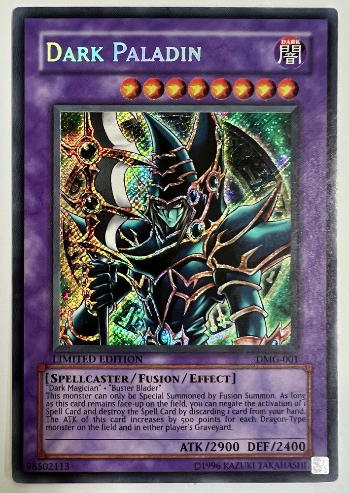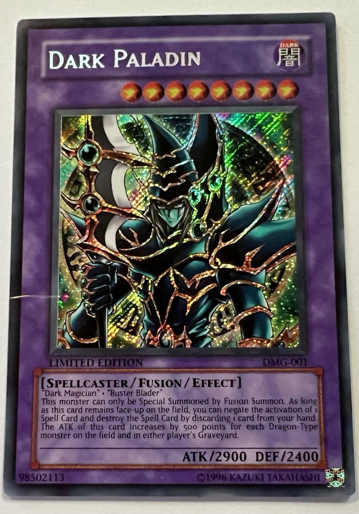 Yu-Gi-Oh Dark Paladin DMG-001 Duel Master's Guide Limited Edition THE CONDITION OF THE CARD IS MODERATLY PLAYED AND DOSE HAVE A MEDIUM SIZED DENT ON THE FRONT AND BACK OF CARD. PLEASE SEE ALL THE PICTURES FOR THE EXACT CARD THE BUYER WILL RECEIVE. THE CARD WILL BE SHIPPED SLEEVED AND TOP-LOADED IN A BUBBLE MAILER PROTECTED BY CARDBOARD. PLEASE CHECK OUT MY OTHER LISTINGS AS I WILL COMBINE SHIPPING. THANK YOU FOR YOUR BUSINESS!