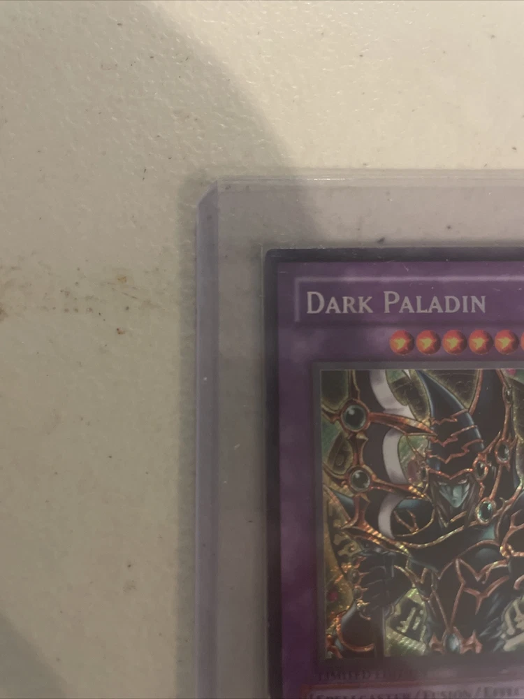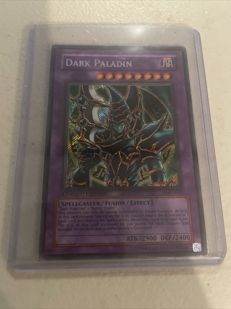 This Limited Edition YuGiOh Dark Paladin card is a must-have for collectors and fans of the popular trading card game. Featuring a powerful 2900 Attack power and 2400 Defense/Toughness, this DARK Spellcaster/Fusion/Effect Monster is sure to dominate the battlefield. The card is made of high-quality card stock and has a beautiful holo foil finish, making it a great addition to any collection. It was manufactured by Konami and is part of the set 'The Dark', with the card number DMG-001. This card is in excellent condition and comes in a protective sleeve. It has never been graded but it is a vintage card that is perfect for collectors of all ages. This Dark Paladin card is sure to be the highlight of any collection and is a must-have for any serious YuGiOh player. Checkout all photos to get a better sense of the condition.