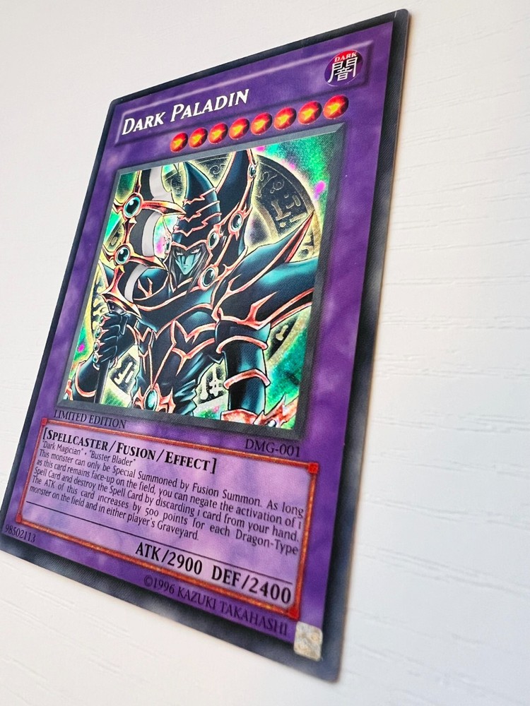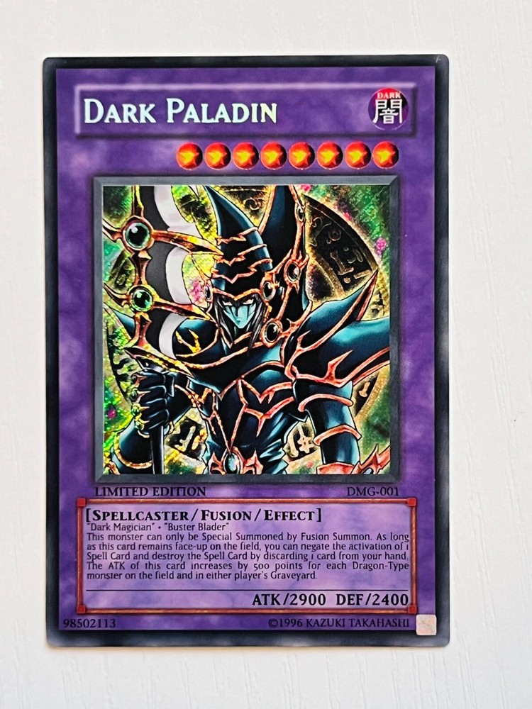 About this Listing: You will receive the exact card in the photos: Yu-Gi-Oh! YuGiOh Dark Paladin DMG-001 - Secret Rare Limited Edition Holo in Near Mint Condition. As an iconic card of the series, this rare and valuable Vintage Yu-Gi-Oh! card is a true gem for collectors and enthusiasts alike. Having only one previous owner makes this listing a one-of-a-kind buy for any serious collector. Card is in English. Only one previous owner (me): This card has been well preserved in a collection binder I've personally held for 20+ years. Condition: T he photos are high resolution. You can zoom in and out to see the card's details on both the front and back. Please let me know if you would like to see more photos. Shipping: This card will remain sleeved, and put into a team bag. It will then be wrapped in bubble wrap, and packed tightly so it arrives in the same condition you see it in. I ship USPS priority mail, and all orders go out within 1-3 business days with the tracking number provided. Thank you for looking!