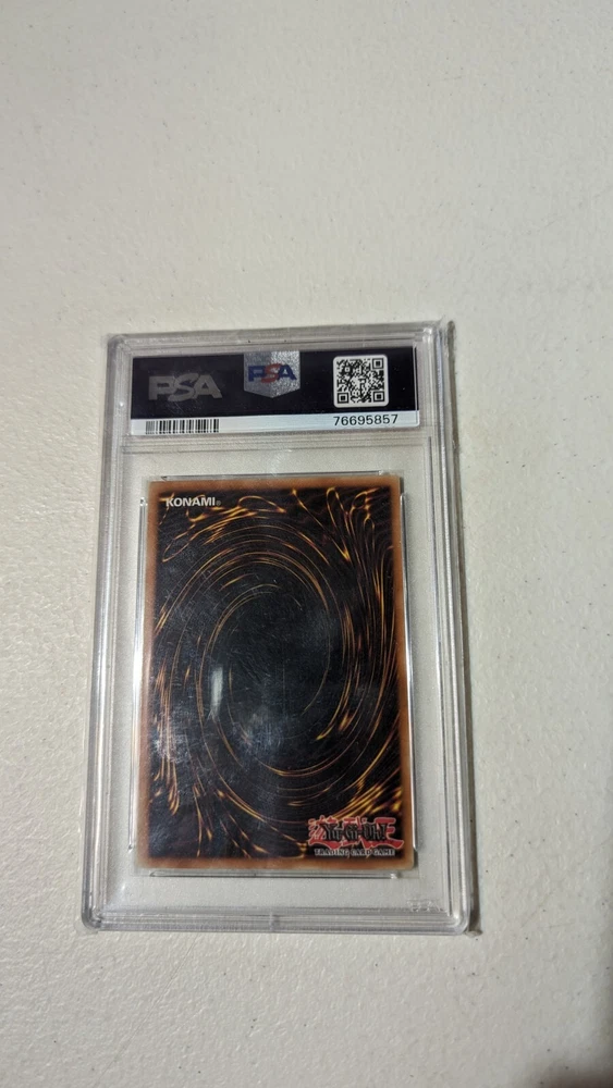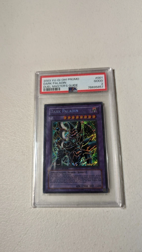 Own this rare and vintage YuGiOh Dark Paladin DMG-001 - Secret Rare Limited Edition card, featuring a DARK Spellcaster/Fusion/Effect Monster character. This card is PSA graded and features a holo finish, making it a must-have addition to any Yu-Gi-Oh! TCG collection. The card is in excellent condition and comes with certification number 76695857 from PSA. It has a defense/toughness of 2400 and an attack/power of 2900. The card size is Japanese and it was manufactured by Konami in 1996 in the United States. This card is perfect for collectors and fans of the Yu-Gi-Oh! franchise.