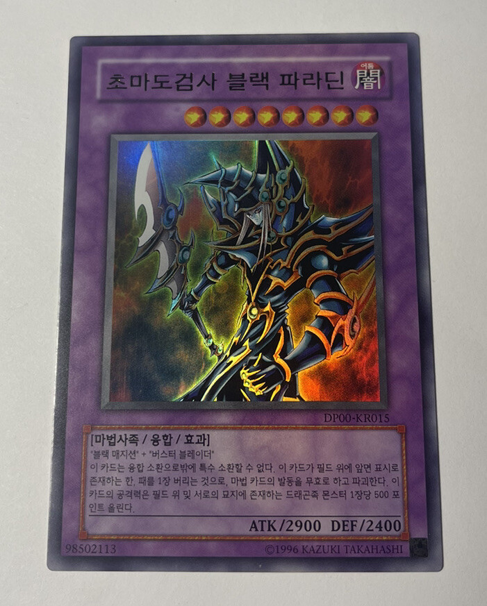 YuGiOh - Dark Paladin - DP00-KR015 - Ultra Rare Korean Holo. NM Cards will be shipped in a penny sleeve inserted into a top loader and mailed in a bubble mailer with tracking provided All orders will be shipped same day or following morning at the latest. Any questions feel free to message me Thank you. If You Are Planning On Purchasing Multiple Items Message Me To Combine Shipping. I Also Offer Discounts For Purchases Of Multiple Items. Near Mint to Mint (NM-Mint) = A Near Mint to Mint condition card can range from Near Mint to Mint condition and we would grade most of these cards an 8/10 or 9/10. NM-Mint condition cards may have a few minor imperfections such as nicks on edges or light scratches Lightly Played (LP) = A card in this condition has several imperfections such as nicks, minor scuffing, edge wear, clouding and/or light scratches. Moderately Played (MP) = A card in this condition has noticeable play wear including edge wear, nicks, scratches, clouding, and/or scuffs Heavy Played (HP) = A Heavy Played card is damaged in a way that could make it unplayable in tournaments, even in a sleeve. This damage may include heavy wear, creases, dents, scratches, bends, scuffs, inking, water damage, clouding and/or other types of damage. Damaged (DMG) = A Damaged card is damaged in a way that most likely is unplayable in tournaments, even in a sleeve. This damage may include heavy wear, creases, dents, scratches, bends, scuffs, tears, inking, water damage and/or other types of damage.