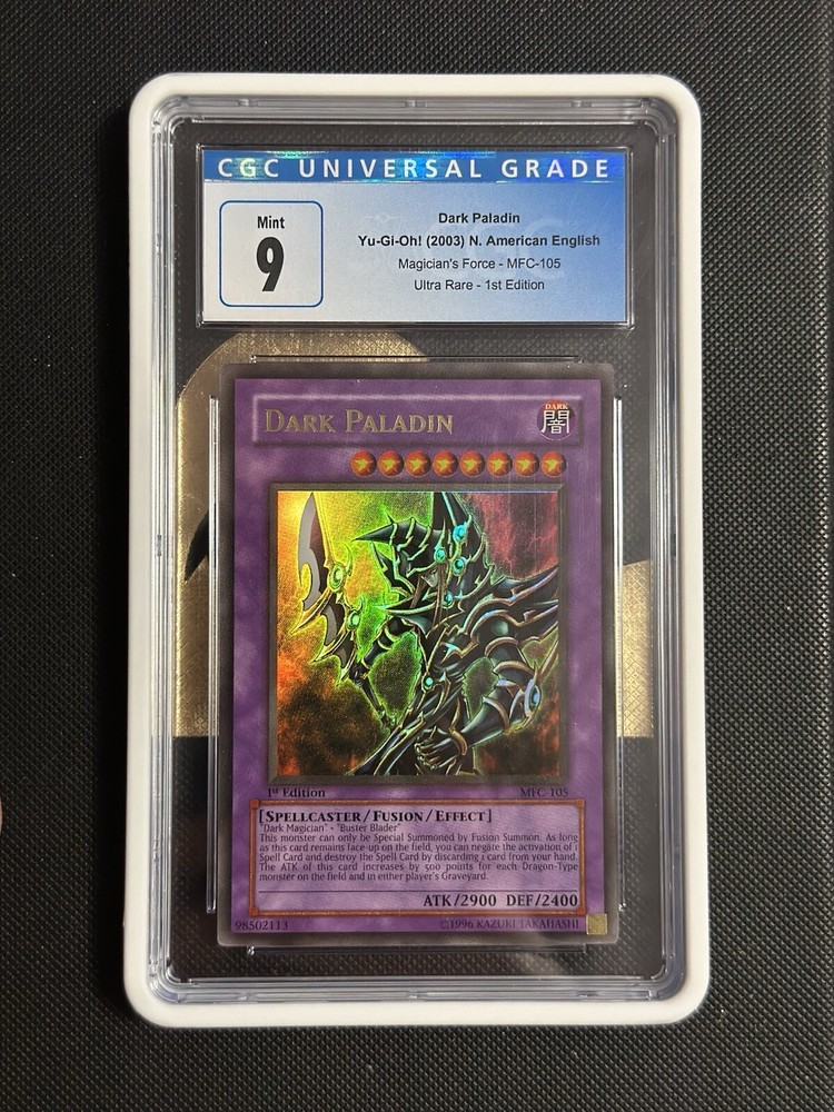 This YuGiOh! card is a CGC 9 - 1st Edition Dark Paladin from the Magician's Force set. With corrected art, this English ultra rare card features the character Dark Paladin and was manufactured in 2003. It is a great addition to any collector's Yu-Gi-Oh! TCG set and has only been graded, not described by condition. The card comes from a smoke-free environment and has been stored in a protective sleeve. Don't miss your chance to own this rare card! Feel free to message for more pictures!