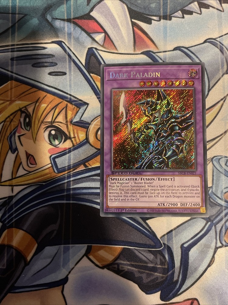 Hello there! This Yu-Gi-Oh! card features the legendary Dark Paladin, as seen in the Battle City arc. The card is a Secret Rare from the Speed Duel: Battle City Box set, with 1st Edition printing and near mint or better condition. The character on the card is Yugi Muto, and the game is Yu-Gi-Oh! The card is in English language and has the rare feature of being ungraded. The card's name is Dark Paladin and it belongs to the Collectible Card Games category, under CCG Individual Cards. The card's attributes are MTG:Color Darkness and Rarity Secret Rare. This card is a must-have for any Yu-Gi-Oh! collector and fan. This listing is for 1x Dark Paladin (SBCB) - 1st Edition, Secret Rare Near Mint/Mint. You will receive (1) copy of the Dark Paladin in the photo provided. Ships extra securely to maintain item conditions. Thanks for looking! - SpirituallyEvil