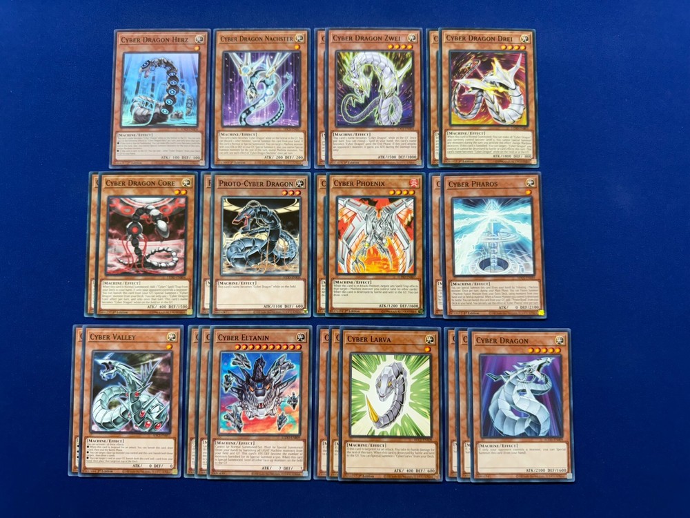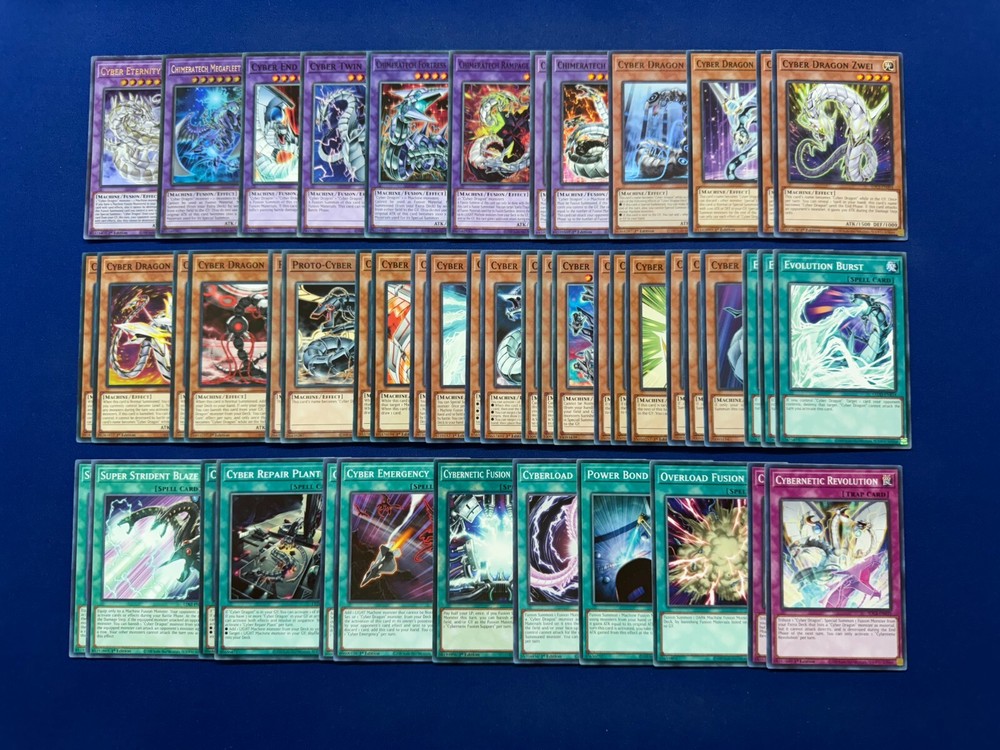 This deck was designed and tested to be ready to play! All cards are in near mint condition (Small chance of lightly played when older cards are involved). By purchasing this item you will receive the following cards: Extra Deck (x8): Cyber Eternity Dragon (x1) - Ultra Rare Chimeratech Megafleet Dragon (x1) - Ultra Rare Chimeratech Overdragon (x2) - Common Chimeratech Fortress Dragon (x1) - Common Chimeratech Rampage Dragon (x1) - Common Cyber Twin Dragon (x1) - Common Cyber End Dragon (x1) - Common Monsters (x25): Cyber Dragon Herz (x1) - Super Rare Cyber Dragon Nachster (x1) - Common Cyber Dragon Zwei (x2) - Common Cyber Dragon Drei (x2) - Common Cyber Dragon Core (x2) - Common Proto-Cyber Dragon (x2) - Common Cyber Phoenix (x2) - Common Cyber Pharos (x2) - Common Cyber Valley (x2) - Common Cyber Dragon (x3) - Common Cyber Larva (x3) - Common Cyber Eltanin (x3) - Common Spell (x13): Evolution Burst (x3) - Common Super Strident Blaze (x2) - Common Cyber Repair Plant (x2) - Common Cyber Emergency (x2) - Common Cybernetic Fusion Support (x1) - Common Cyberload Fusion (x1) - Common Overload Fusion (x1) - Common Power Bond (x1) - Common Trap (x2): Cybernetic Revolution (x2) - Common Shipping and Handling: Both Domestic and International Shipping are offered. All deck items are shipped via First Class Parcel Service (3-5 Days) and comes with tracking. Priority Mail Service (1-3 days) is also offered for Domestic buyers. Price is calculated based on the buyer's location. Payment: Payments are due within 3 days of ordering. Otherwise an Unpaid Item Case will be opened. If you have any questions or concerns, send a message and we'll answer as soon as we can! Please remember to leave feedbeck if you can, especially if you enjoy your purchase! Thank you for your patronage and support!
