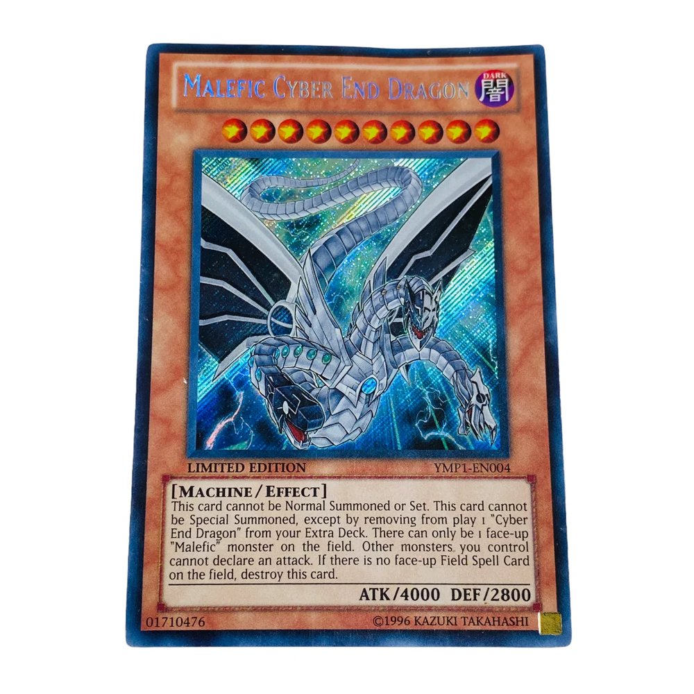 Yu-Gi-Oh! Malefic Cyber End Dragon Limited Edition Secret Rare Trading Card YMP1-EN004 PACKAGE INCLUDES: 1x Card YOU WILL RECEIVE EXACTLY WHAT THE PACKAGE INCLUDES. THE PHOTOS ARE A REPRESENTATION OF WHAT THE PACKAGE INCLUDES IN THE CONDITION OF YOUR CHOICE. IF IT IS NOT IN THE PHOTO NOR LISTED ABOVE DO NOT ASSUME IT IS INCLUDED. SINCE WE HAVE THE SAME ITEM(S) IN MULTIPLE DIFFERENT CONDITIONS THE "CHOOSE CONDITION" OPTION ALLOWS YOU TO CHOOSE THE CONDITION OF THE ITEM(S). Condition Table: For Parts- An item for parts or repair that does not operate as it was intended. This includes items that are missing pieces, not fully operational and will need additional service, repair, and/or parts. Sold AS-IS. Poor- An item with obvious and major signs of wear, tear, holes, fading, damage, etc. 100% Authentic & Tested Working. Good- An item with minor signs of wear, tear, holes, fading, damage, etc. 100% Authentic & Tested Working. Very Good- An item with little to no signs of wear, tear, holes, fading, damage, etc. 100% Authentic & Tested Working. Brand New- An item that has never been used and shows no damaged. PLEASE MESSAGE US BEFORE YOU PURCHASE IF YOU ARE UNSURE WHAT YOU WILL BE RECEIVING