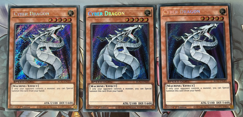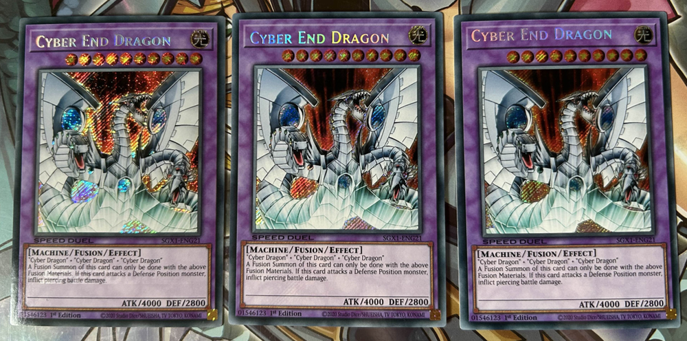 Three copies of the Yu-Gi-Oh! TCG Cards Cyber Dragon & Cyber End Dragon SGX1-ENG01/G21 in Secret Rare 1st Edition This collection will be sent via Royal Mail and will be properly protected. Please check out my other listings and don't hesitate to contact me with any inquiries. Always willing to take further photographs of specific card listings when requested and will work with you to create multiple listing discounts etc.