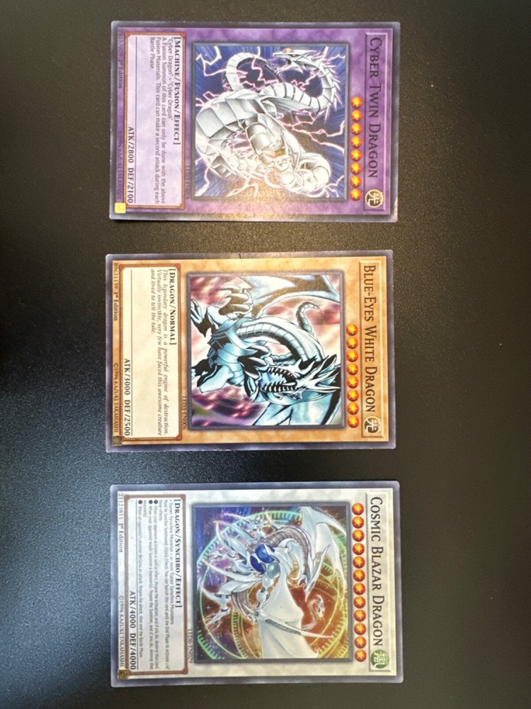 This is an amazing addition to any Yu-Gi-Oh! collection! The ultra-rare Blue-Eyes White Dragon, Cosmic Blazar Dragon, and Cyber Twin Dragon look stunning with their first-edition finish. With 3000 ATK and 2500 DEF, these cards dominate duels while being a prized piece for collectors. Konami’s quality shines through, making it a must-have for fans and competitive players alike. Absolutely worth it!