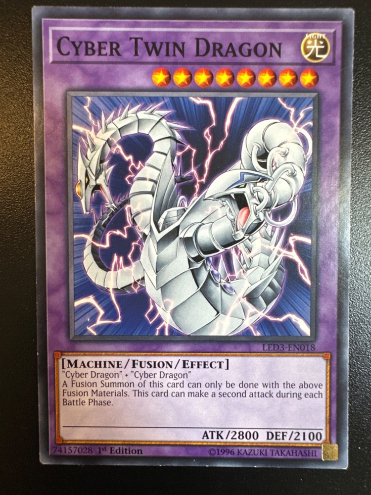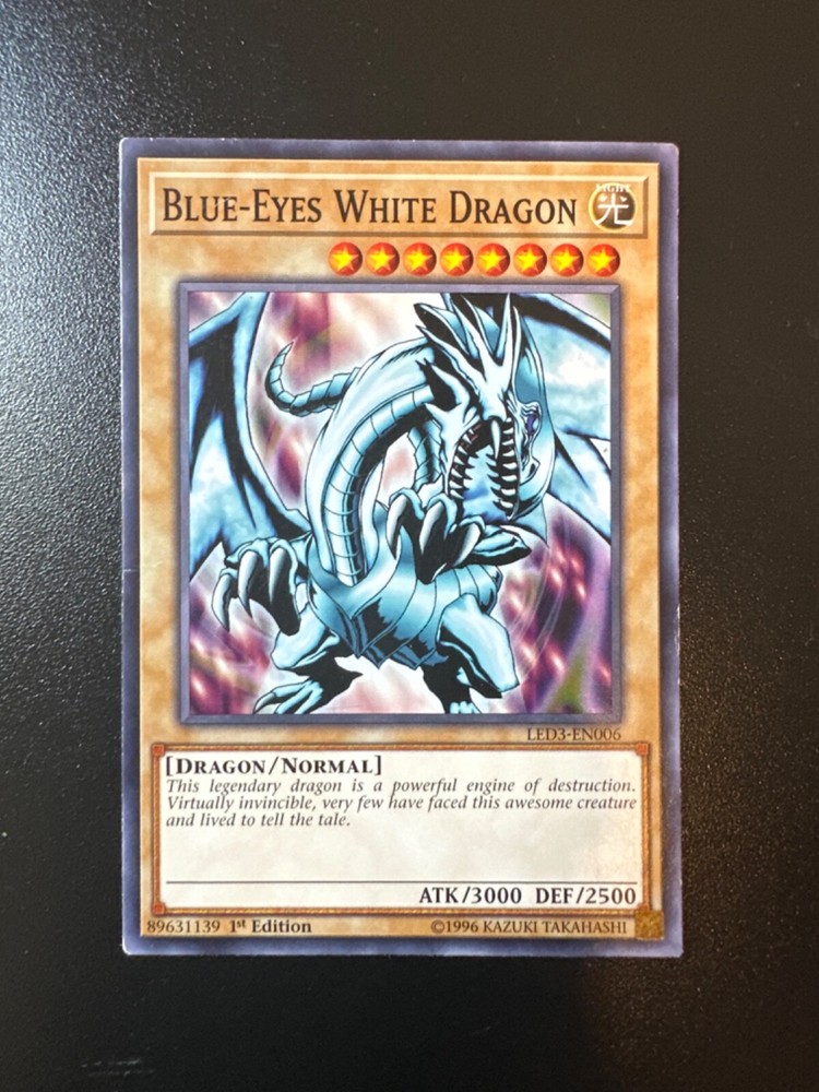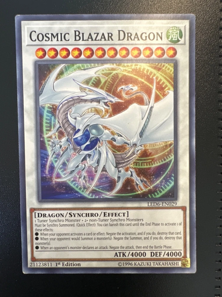 This incredible Yu-Gi-Oh! TCG cards features the powerful Blue-Eyes White Dragon, Cosmic Blazar Dragon, and Cyber Twin Dragon. With an ultra-rare rarity and first edition features, these cards is a must-have for any serious collector or player. The card boasts an attack power of 3000 and a defense/toughness of 2500, making it a formidable opponent in any battle. The card is manufactured by Konami and is part of the CCG Individual Cards and Collectible Card Games categories, as well as Toys & Hobbies. The card number is LED3-EN006, LED6-EN029, and LED3-EN018, and it comes in a regular finish. This card is perfect for anyone who wants to add a rare and powerful card to their collection or deck.