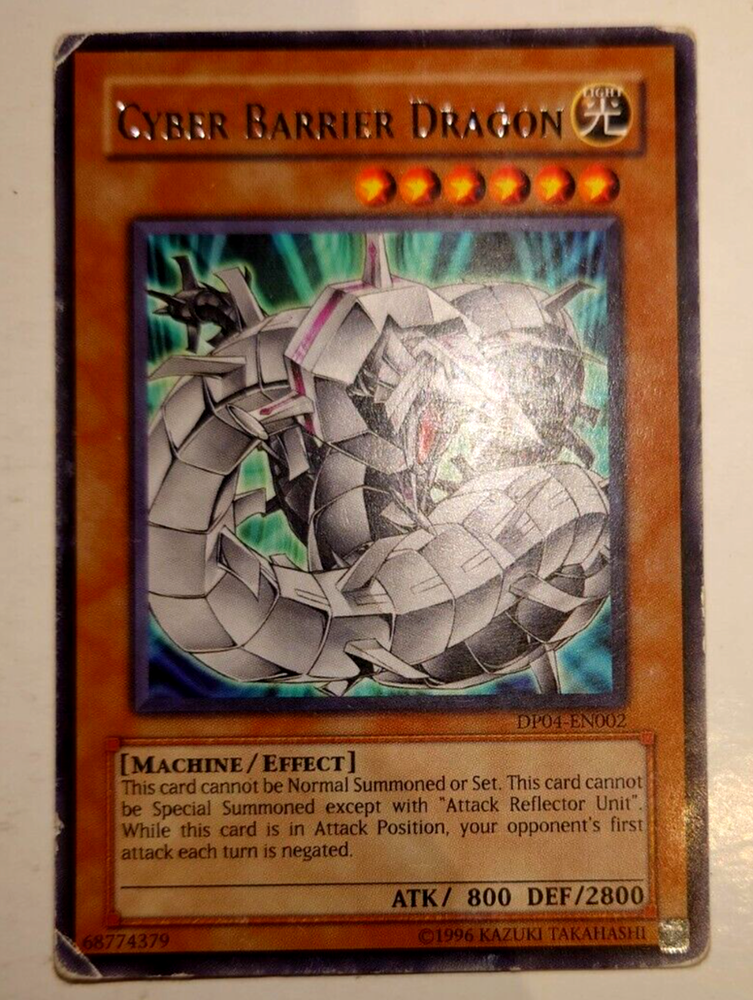 This Yu-Gi-Oh! TCG card is a rare Cyber Barrier Dragon from the set of Zane Truesdale with card number DP04-EN002. The Machine-type monster has an attack power of 800 and a toughness of 2800. This effect card is perfect for collectors of CCG individual cards and collectables in the game. Its colour is light and it belongs to the Yu-Gi-Oh! TCG game.
