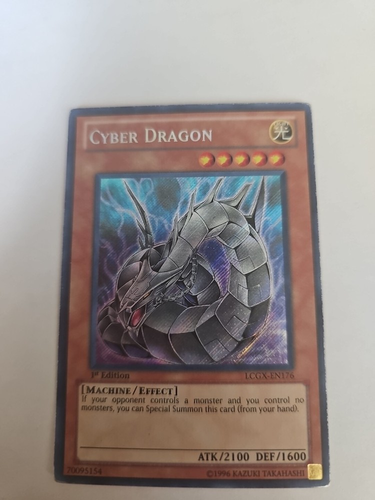 This Yu-Gi-Oh! TCG card features the powerful Cyber Dragon creature, with a Secret Rare rarity and a 1st Edition status. The card belongs to the Legendary Collection 2: The Duel Academy Years set, and has the card number LCGX-EN176. It is an Effect type card with a Machine Creature/Monster Type, and is colored Light. The card is perfect for collectors and players of the Yu-Gi-Oh! Trading Card Game. Add it to your collection or use it to strengthen your deck. Don't miss out on the opportunity to own this rare and sought-after card.