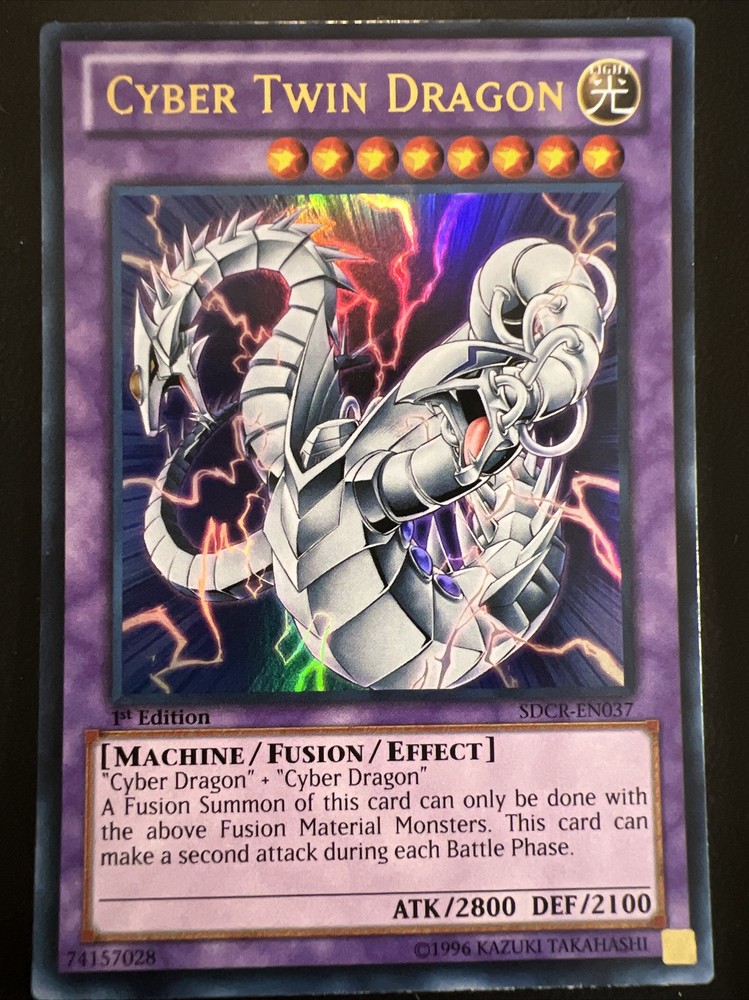This Yu-Gi-Oh! TCG Cyber Twin Dragon card is a must-have for any serious collector. Featuring 2800 Attack/Power and 2100 Defense/Toughness, this Ultra Rare card is from the Cyber Dragon Revolution set and is a 1st Edition. Its Machine/Fusion/Effect Creature/Monster Type and Light Attribute make it a unique addition to any collection. The card is identified by its card number Sdcr-En037 and is classified as a Fusion Card Type. This card is perfect for any player looking to beef up their deck or collector looking to add a rare piece to their collection. Buy multiple cards or item and save with combined shipping. MUST MESSAGE SELLER BEFORE CHECKOUT to receive combined shipping discount!! All cards shipped securely with sleeve and top loader. Please checkout my eBay store CardShark. New cards being added daily. Shipping usually within 1-2 days of payment. Please contact me immediately if there is ever an issue with a purchase. It will be remedied ASAP. If you are happy with a purchase please feel free to FOLLOW my store CardShark and leave some positive feedback. Thanks for shopping at CardShark and have an amazing day.