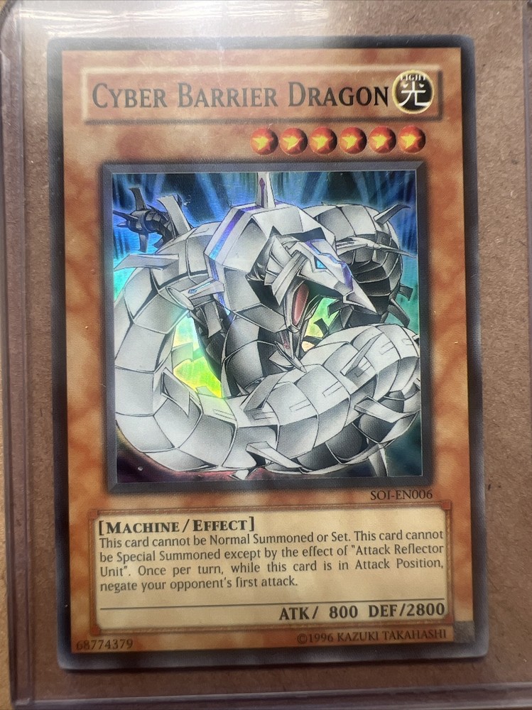 This Yu-Gi-Oh! TCG card features the powerful Cyber Barrier Dragon, a holographic rare card with 800 attack and 2800 toughness. The card belongs to the set "Shadow of Infinity" and has the card number SOI-EN006. Its creature type is machine and it is an effect card. This card is 100% authentic and perfect for collectors and players alike.