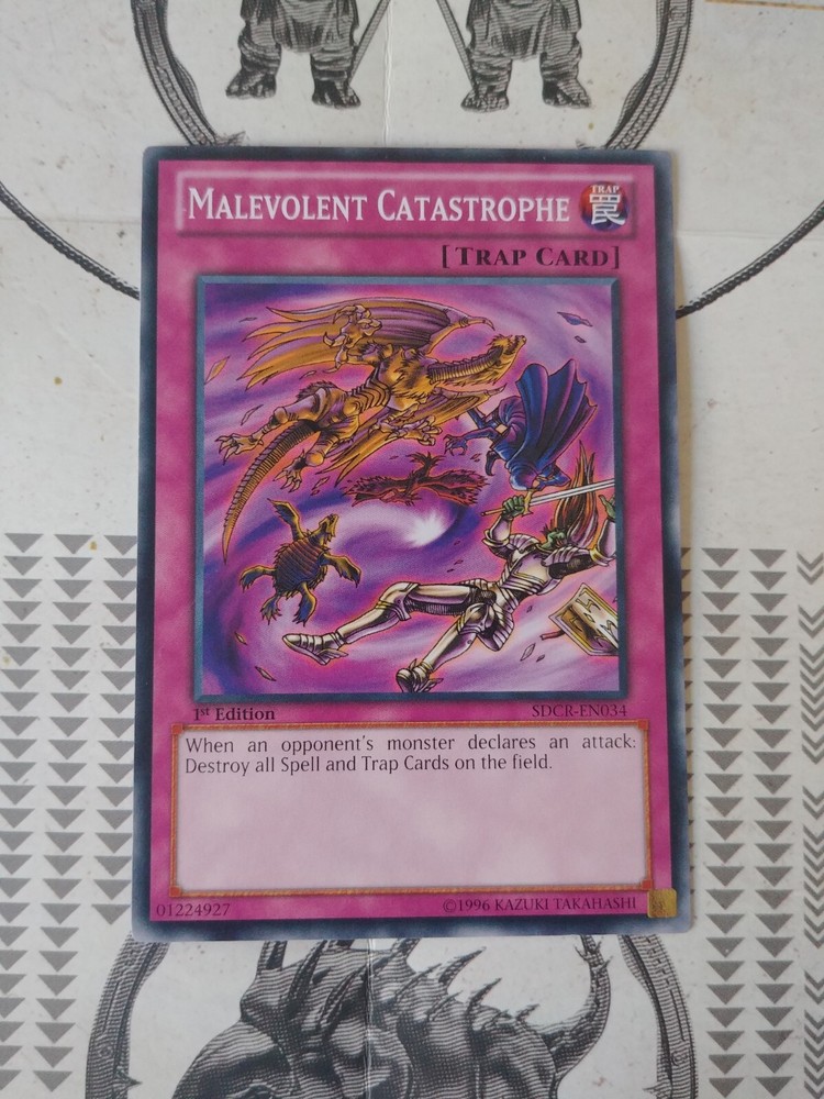 This Yu-Gi-Oh! TCG card is a 1st Edition Malevolent Catastrophe from the Cyber Dragon Revolution set. It is a Trap-Normal card with a card number of SDCR-EN034 and a rarity of Common. The card is in English language and has a regular finish. The card size is standard and is not autographed. It is not a vintage card and is perfect for any collector. The card is in excellent shape and is ready for use in your Yu-Gi-Oh! TCG game.
