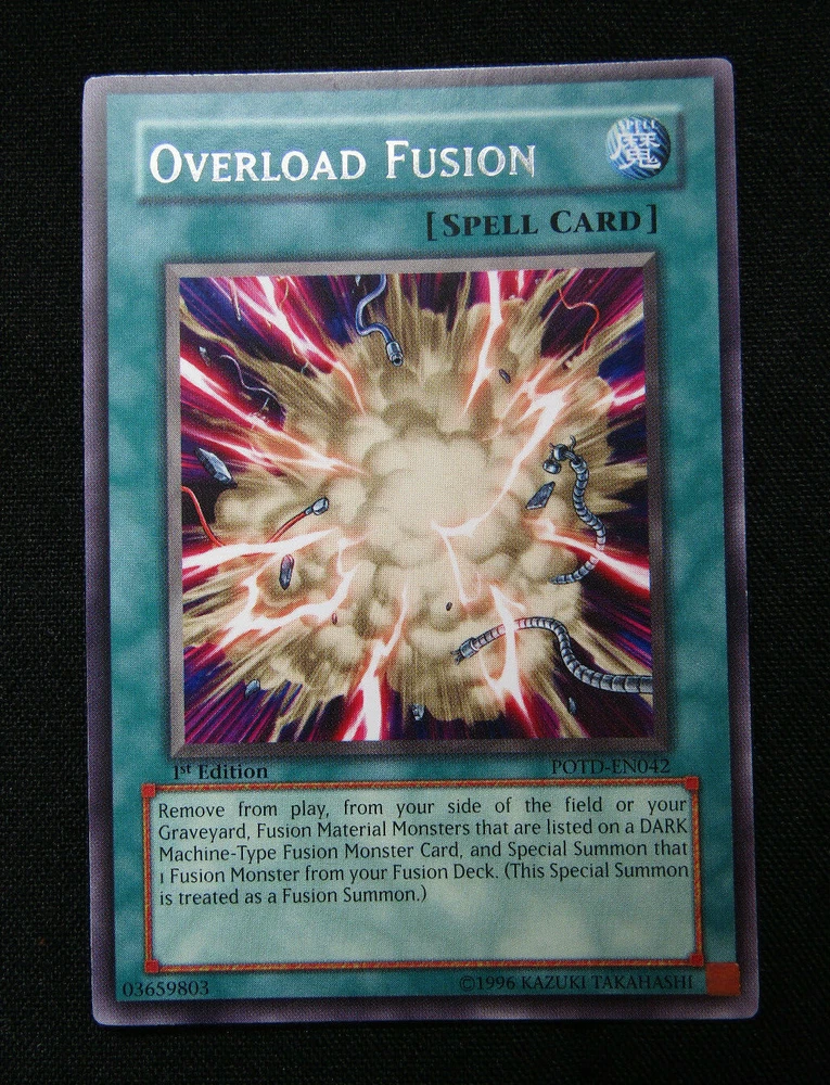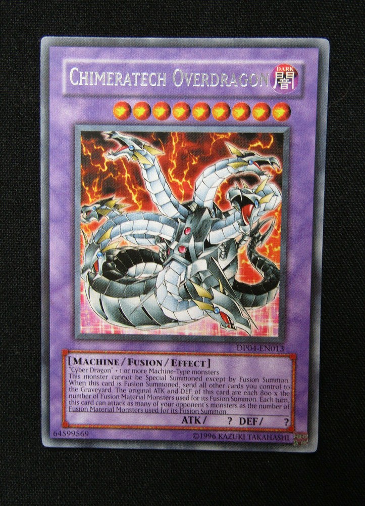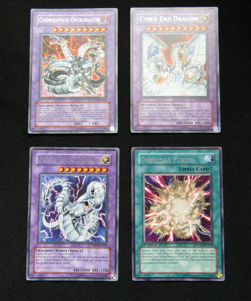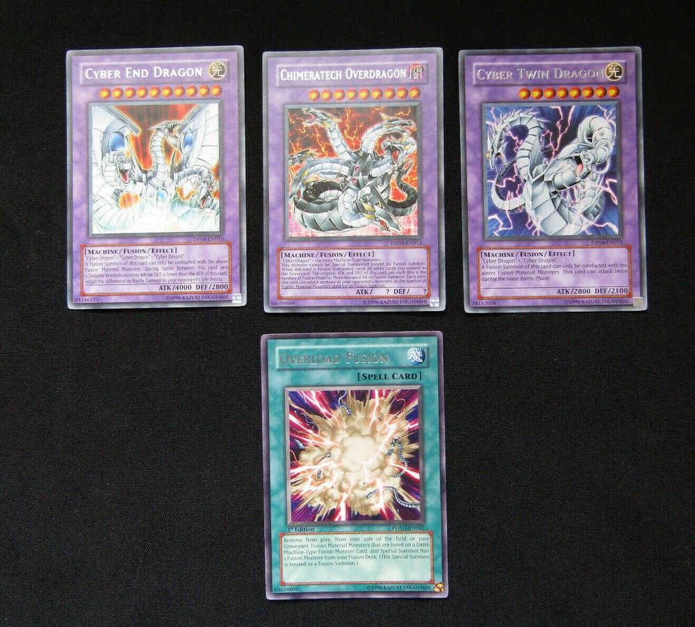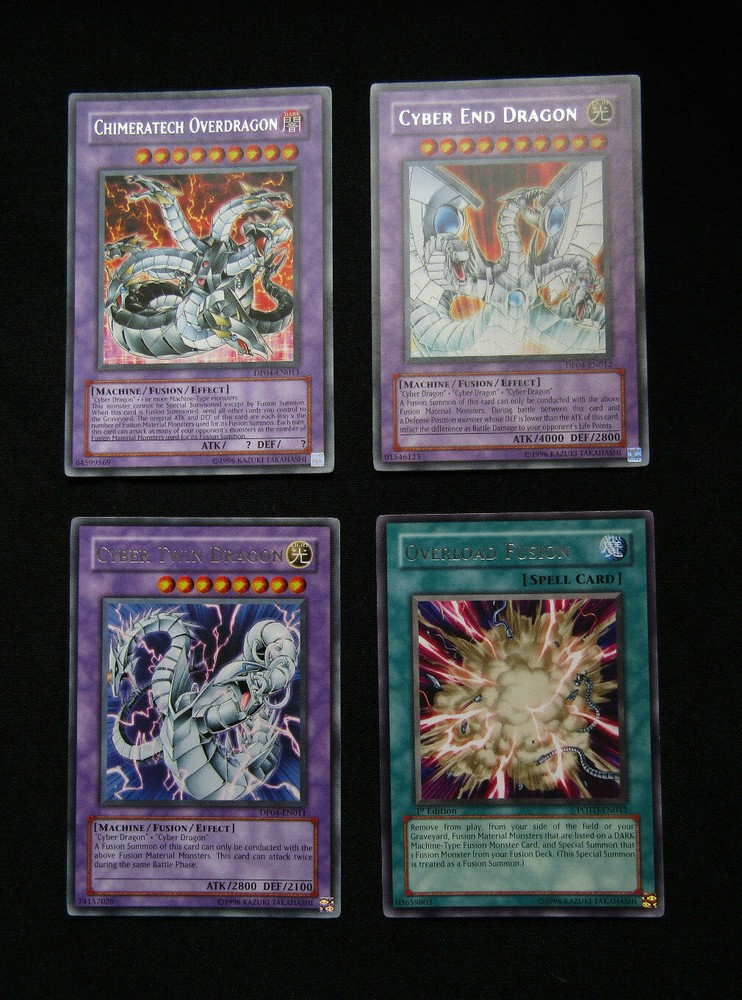 YuGiOh Yu-Gi-Oh Cyber Dragon Set This is a batch of 4 YuGiOh Magic cards All Near Mint/Lightly Played Overload Fusion (POTD-EN042), rare Chimeratech Overdragon (DP04-EN013), rare Cyber Twin Dragon (DP04-EN011), rare Cyber End Dragon (DP04-EN012), rare
