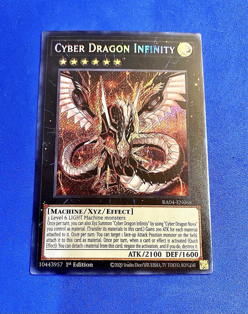 Elevate your Yu-Gi-Oh! TCG collection with the formidable Cyber Dragon Infinity from the Quarter Century Stampede set. This card, featuring the iconic Yami Yugi, is a must-have for enthusiasts and competitive players alike, with its unique Effect type and striking Holo finish. As a 1st Edition Secret Rare with the card number 10443957, it stands as a pinnacle of collectibility and game-play potential. Crafted by Konami and manufactured in the United States, this English-language card is presented in Japanese card size, adhering to the standard dimensions for seamless integration into your deck. It is designed for the age level of 6 and above, ensuring it's accessible for young duelistors looking to harness the power of the Fiend-type creature, Cyber Dragon Infinity.