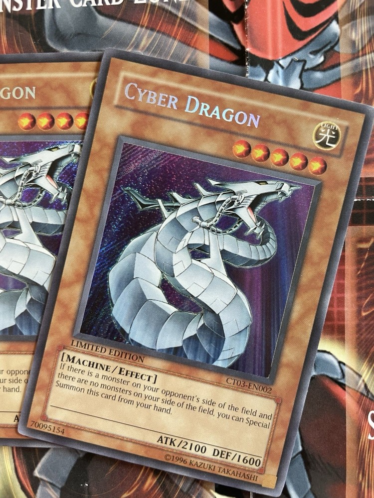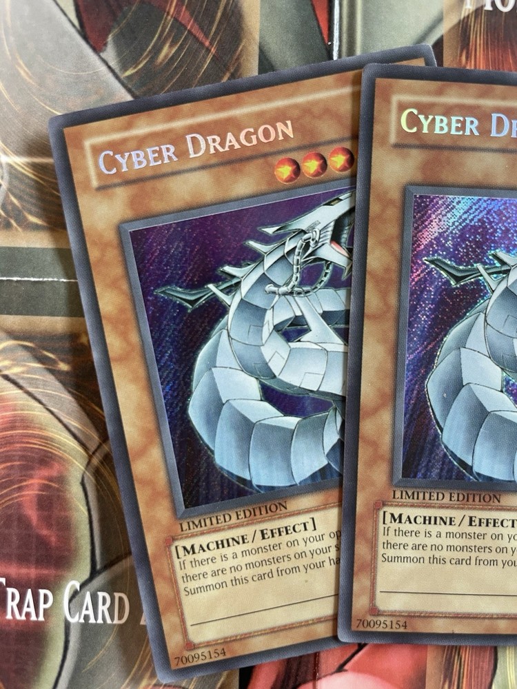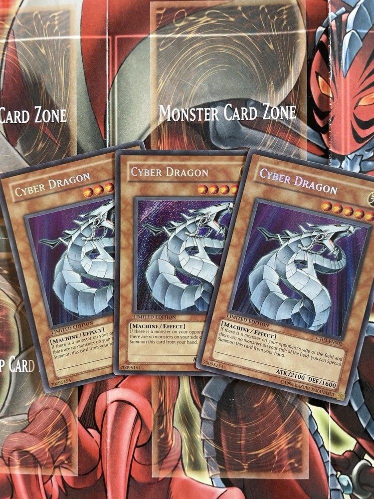 Up for sale are three copies of Cyber Dragon Limited Edition Secret Rare in lightly played condition - enough to fill up a new Cyber Dragon deck. Card will be packed and shipped in a protective sleeve & top loader inside a bubble mailer. If you intend to buy multiple cards, feel free to send a message and I’ll happily combine shipping for the entire order. I am not a professional grader, and am evaluating the condition of these cards to the best of my ability. Please review the photos and reach out with questions before buying if you’re unsure.