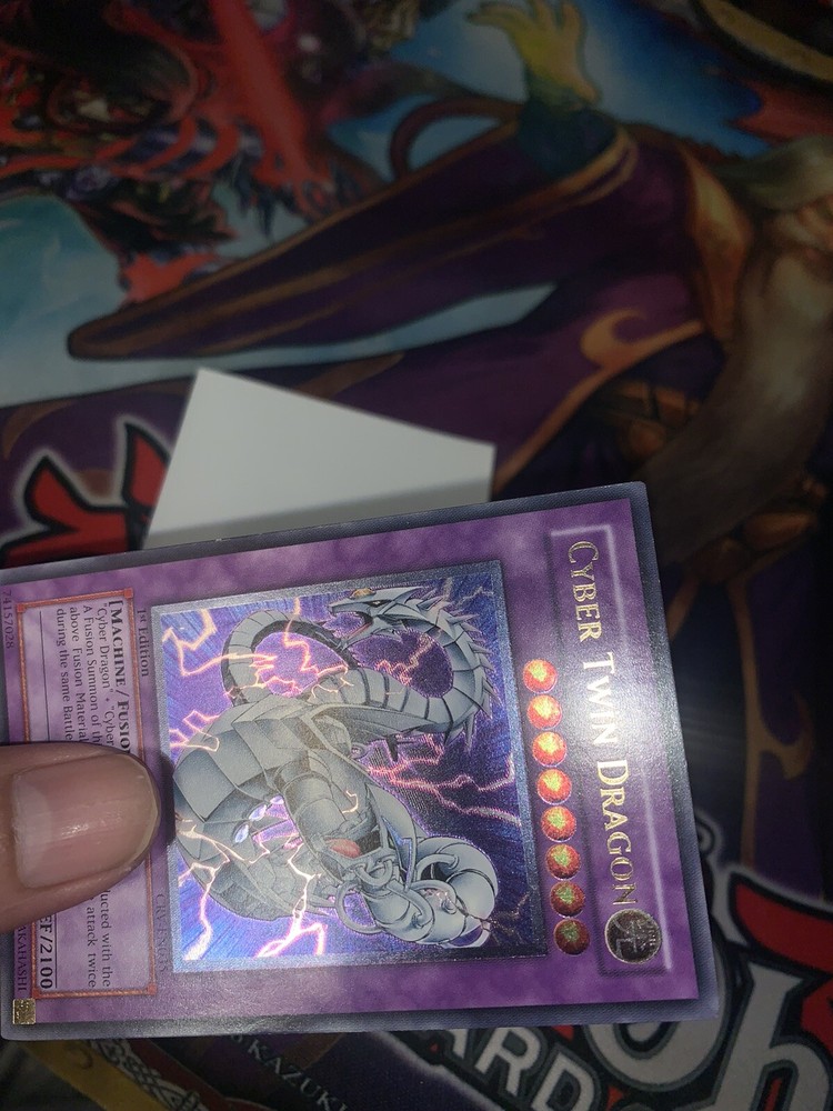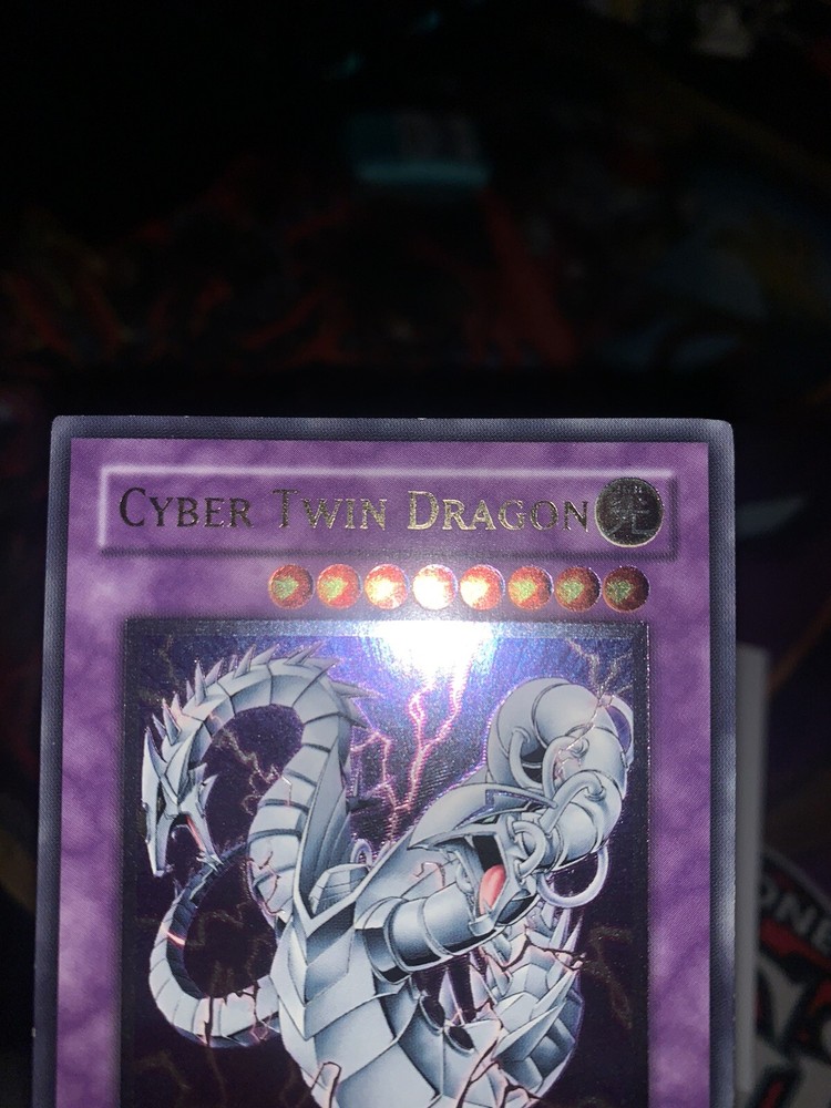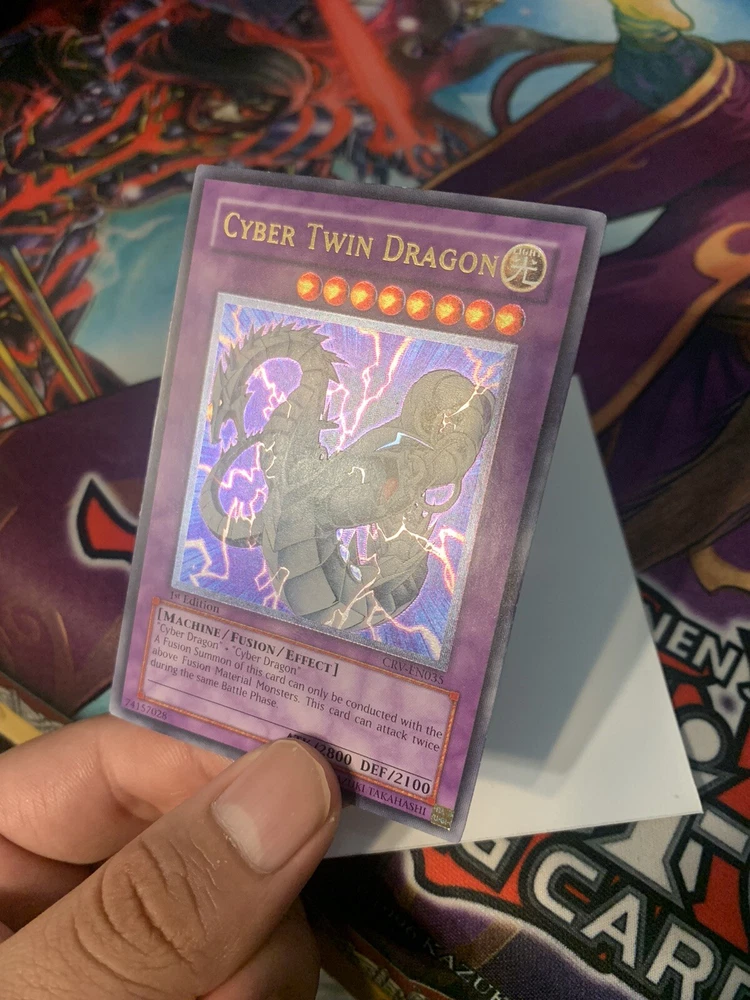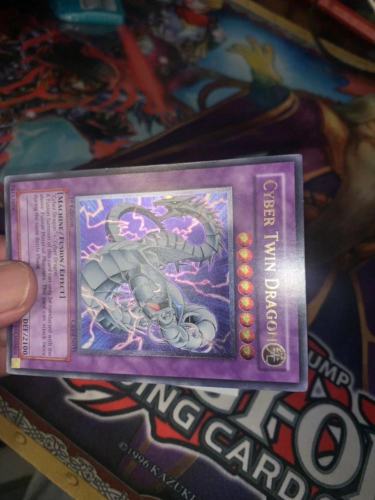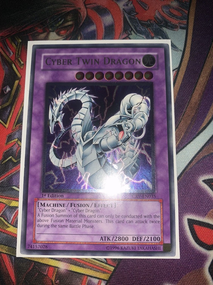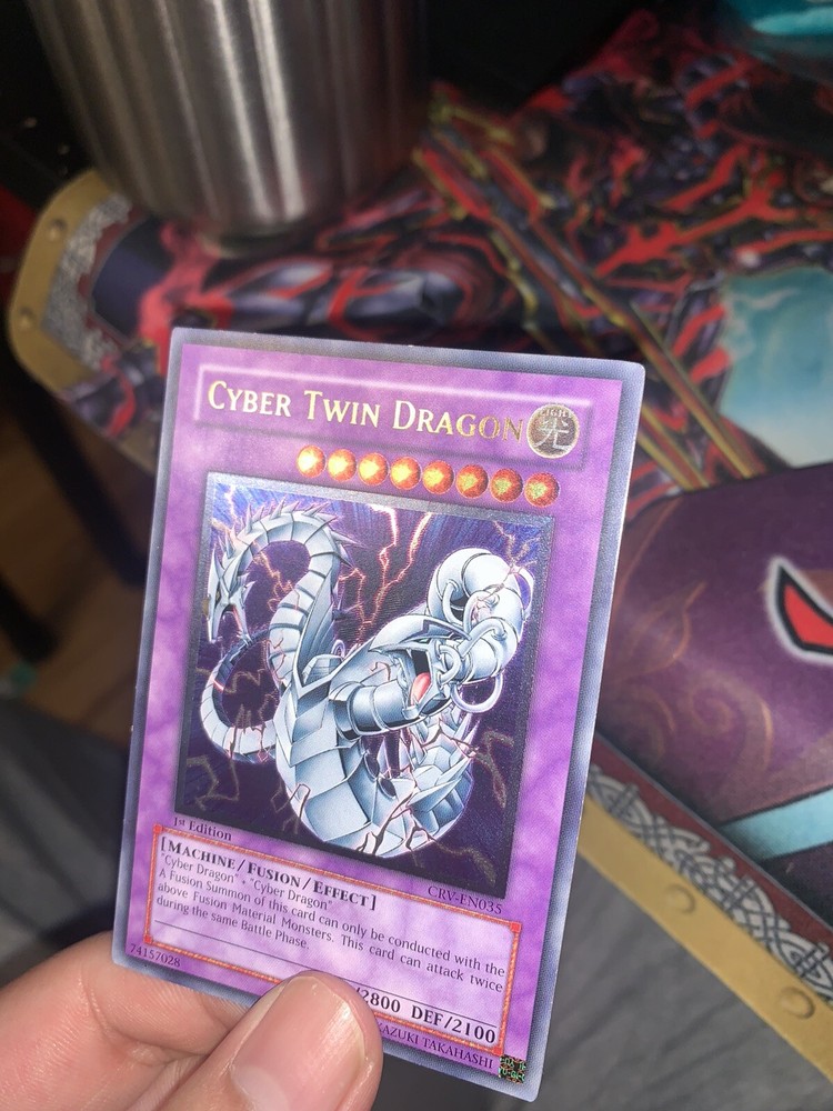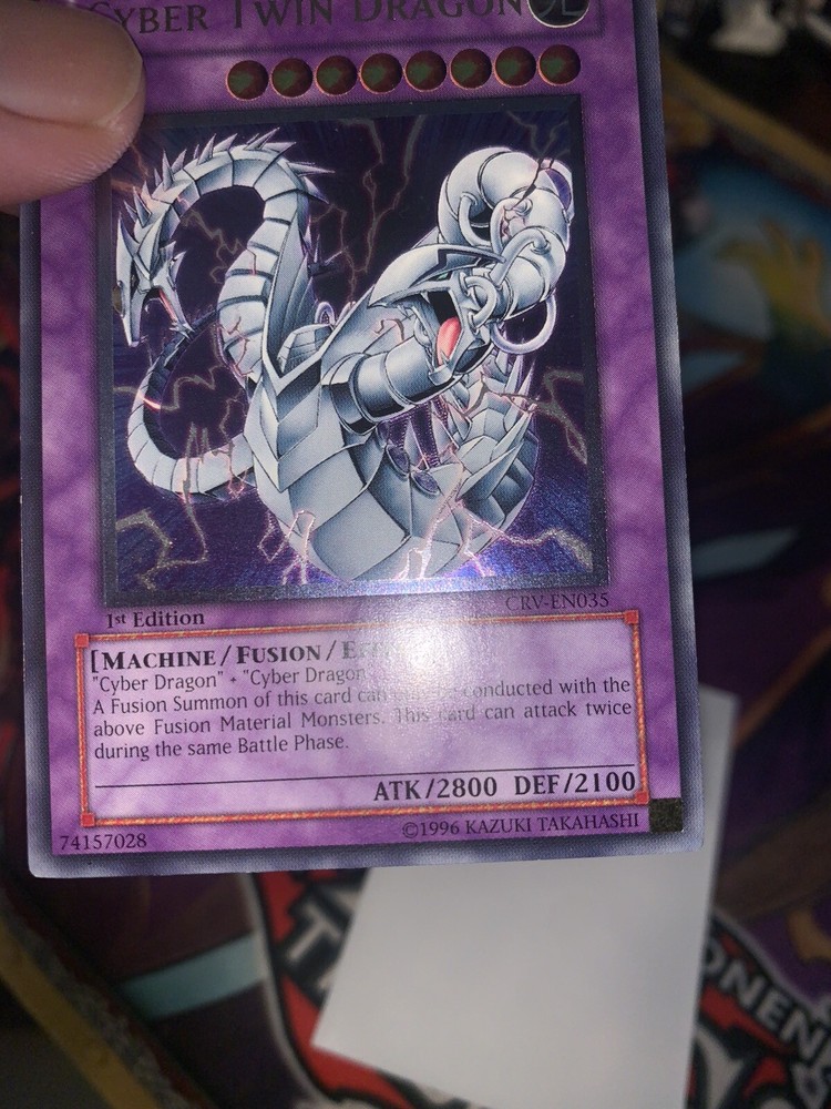 Very clean, NM card. Please see photos for clarity on how the card looks at every angle. Feel free to ask for more photos. I listed as VLP as well because of the 2 very minor edge wear spots that you can see in the photos. Will be tracked/insured. Feel free to ask more questions. Yugioh CRV-EN035 Cyber Twin Dragon Ultimate Rare 1st Edition Near Mint/VLP.