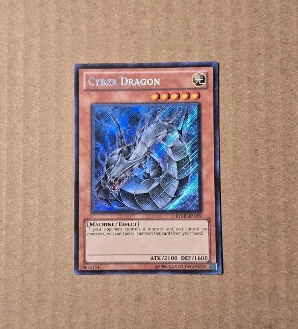 The product is a Yugioh card called Cyber Dragon from the Ra Yellow Mega-Pack set. It is a Secret Rare card, meaning it is highly sought after and rare in the game. This collectible card is a valuable addition to any Yu-Gi-Oh! card collection, especially for fans of the Cyber Dragon type. The card is in limited edition and is a must-have for serious collectors and players of the game.