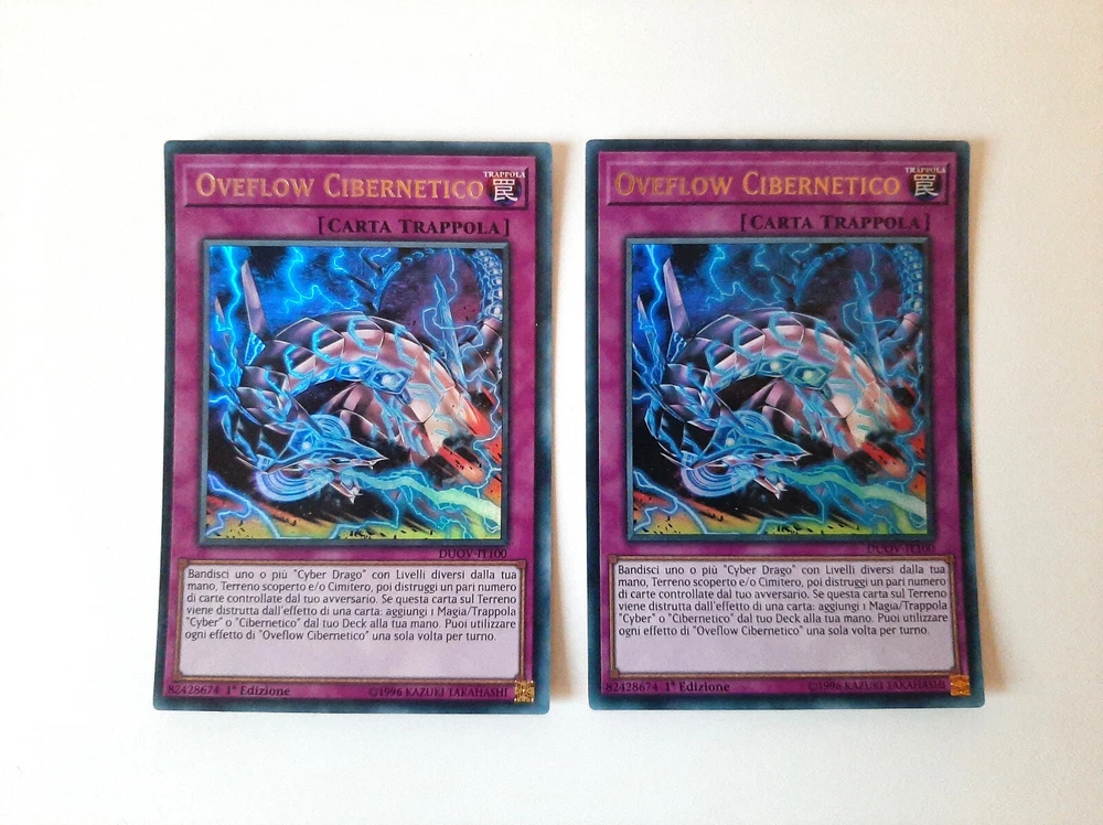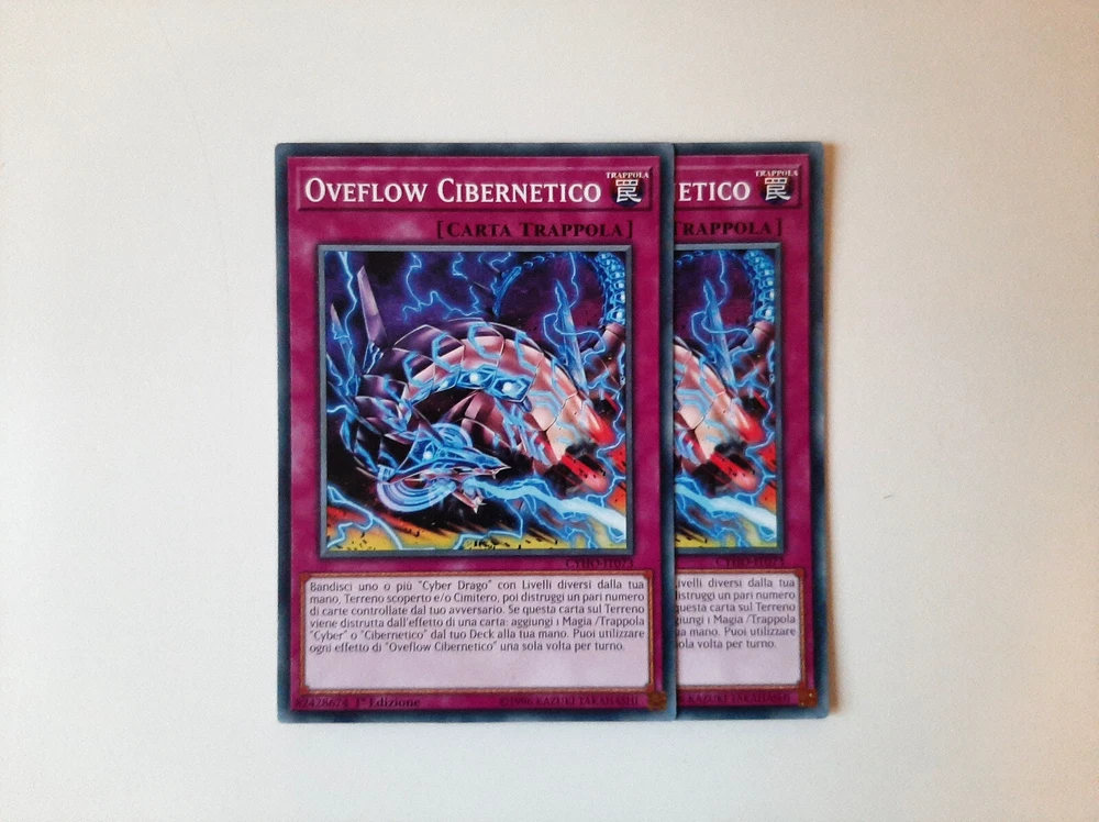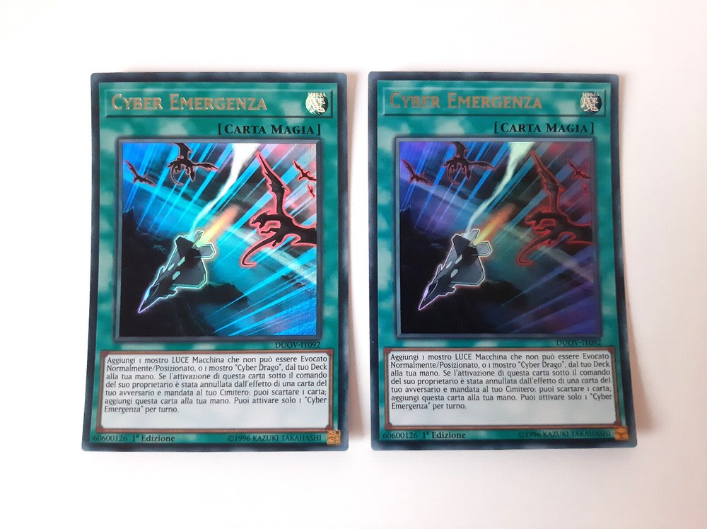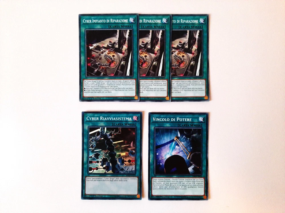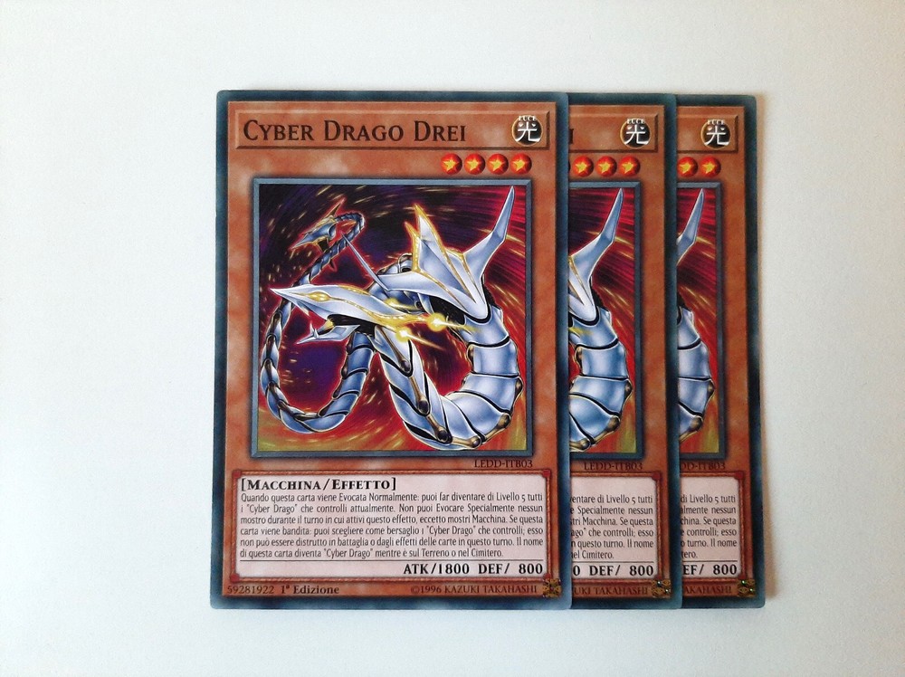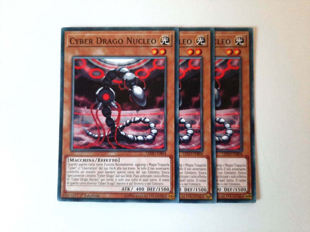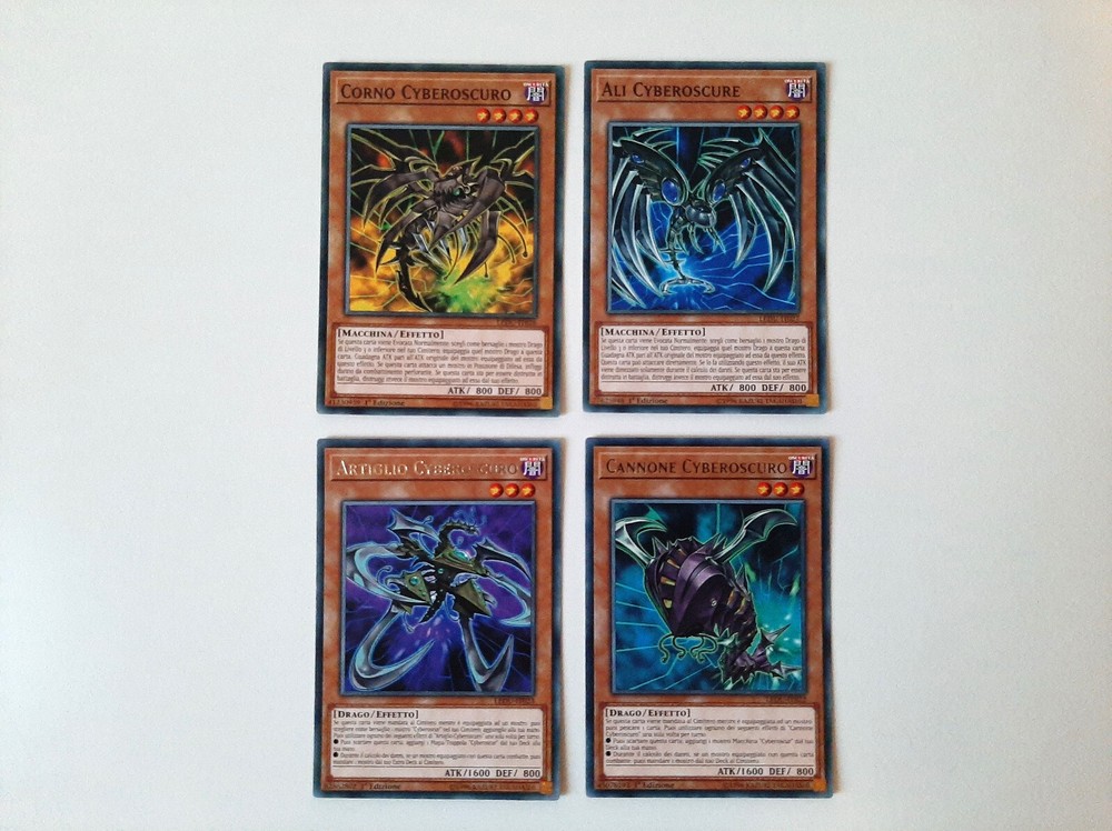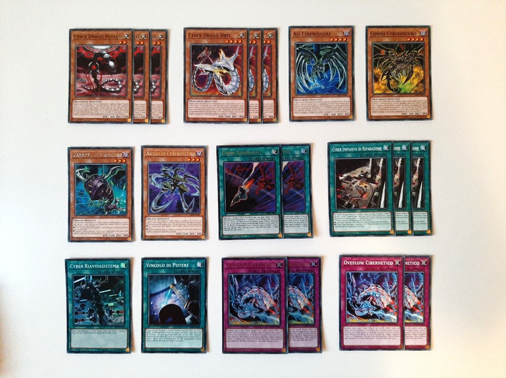 Yu-Gi-Oh! CARTE DECK CYBER DRAGO/CYBEROSURO (Cyber/Cyberdark Dragon Deck Cards) Condizioni della carta/Cards conditions: NEAR MINT Lista carte/Card list (21) Mostri/Monsters 3x CYBER DRAGO NUCLEO (Cyber Dragon Core) - LEDD-ITB04 - Comune - 1°Edizione - Italiano 3x CYBER DRAGO DREI (Cyber Dragon Drei) - LEDD-ITB04 - Comune - 1°Edizione - Italiano 1x ALI CYBEROSCURE (Cyberdark Edge) - LEDU-IT027 - Comune - 1°Edizione - Italiano 1x CORNO CYBEROSCURO (Cyberdark Horn) - LEDU-IT026 - Comune - 1°Edizione - Italiano 1x ARTIGLIO CYBEROSCURO (Cyberdark Claw) - LEDU-IT023 - Rara - 1°Edizione - Italiano 1x CANNONE CYBEROSCURO (Cyberdark Cannon) - LEDU-IT022 - Rara - 1°Edizione - Italiano Magie/Spells 2x CYBER EMERGENZA (Cyber Emergency) - DUOV-IT092 - Ultra Rara - 1°Edizione - Italiano 3x CYBER IMPIANTO DI RIPARAZIONE (Cyber Repair Plant) - LEDD-ITB12 - Comune - 1°Edizione - Italiano 1x CYBER RIAVVIASISTEMA (Cyber Revsystem) - MP19-IT118 - Super Rara - 1°Edizione - Italiano 1x VINCOLO DI POTERE (Power Bond) - LED3-IT022 - Comune - 1°Edizione - Italiano Trappole/Traps 2x OVERFLOW CIBERNETICO (Cybernetic Overflow) - DUOV-IT100 - Ultra Rara - 1°Edizione - Italiano 2x OVERFLOW CIBERNETICO (Cybernetic Overflow) - CHYO-IT073 - Comune - 1°Edizione - Italiano Carte in condizioni Near Mint, come appena spacchettate. Consiglio comunque sempre di vedere bene le foto per accertamenti. Contattatemi per eventuali informazioni, sono sempre a disposizione e cercherò di rispondervi nel minor tempo possibile! Cards in Near Mint conditions, like freshly unpacked. However, I always recommend taking a good look at the photos for verification. Contact me for any information, I am always available and I will try to answer you as quickly as possible!