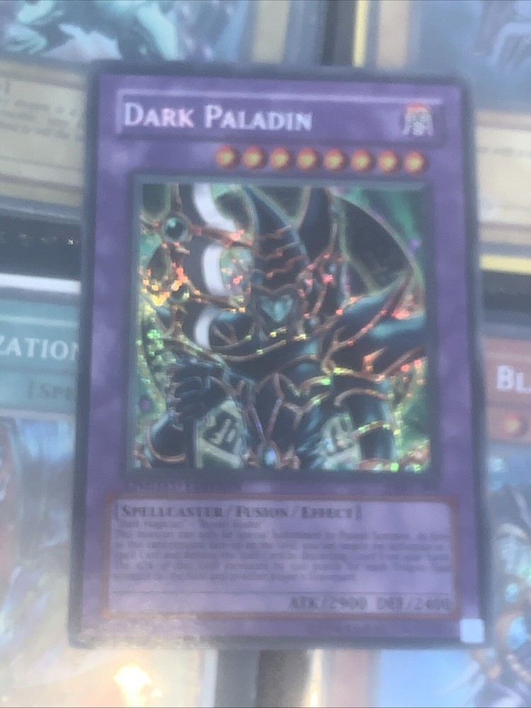 Elevate your Yu-Gi-Oh! TCG collection with the Dark Paladin DMG-001, a Secret Rare gem from the Duel Master's Guide set. As a fusion card with a dark spellcaster theme, it's a must-have for both players and collectors looking to cast a shadow over their opponents. This limited edition card, produced by Konami, boasts a stunning holo design that makes it a standout piece in any card collection. Crafted for the English-language market, Dark Paladin not only serves as a powerful card in the game but also as a collector's item for fans of the Yu-Gi-Oh! universe. Whether you're looking to enhance your deck or cherish a piece of gaming history, this card's unique attributes and rarity make it a worthy addition to your collection. Moderately played to heavily played comes with fast and free shipping.