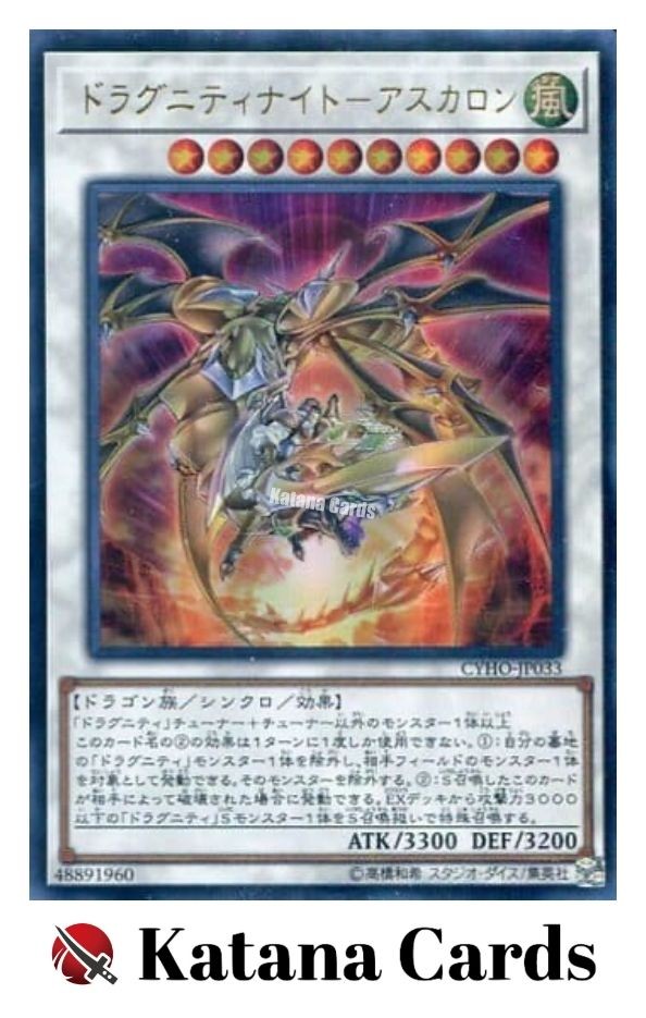 Yugioh Cards | Dragunity Knight - Ascalon Ultra Rare | CYHO-JP033 Japanese C ondition Near Mint to Excellent Yugioh Cards Check our Yugioh cards here. D iscounts!!! Buy more than 2 cards in my store, Save 3 - 5% off for each cards. Yugioh Cards Check our Yugioh cards here. Discounts are applied automatically by simply adding the product to your cart! If the discount is not applied automatically due to eBay's system error, please inform us of the "Discount Error" in the message after purchasing the item. We will manually apply the discount based on the number of items purchased. S hipping We usually ship within 3 - 5 business days of receiving cleared payment. Economy Shipping - No Tracking Number - It takes 7 - 30 days after shipment. Expedited Shipping - Tracking Number - It takes 3 - 10 days after shipment. If you buy more than 2 cards and choose Expedited Shipping, please select Expedited Shipping for just 1 item. We will ship the items in one package. P ayment We can be contacted at any time through eBay messages if you have any questions, comments or product requests. We will respond to you within 24 hours and do our best to help you out! We encourage our customers to contact us with any questions or concerns! We'd like to be sure you are completely satisfied with your purchase. We do not mark merchandise values below value or mark items as gifts. US and International government regulations prohibit such behavior. I nternational Buyers - Please Note Import duties, taxes, and charges are not included in the item price or shipping cost. These charges are the buyers responsibility. Please check with your country's customs office to determine what these additional costs will be prior to bidding or buying.