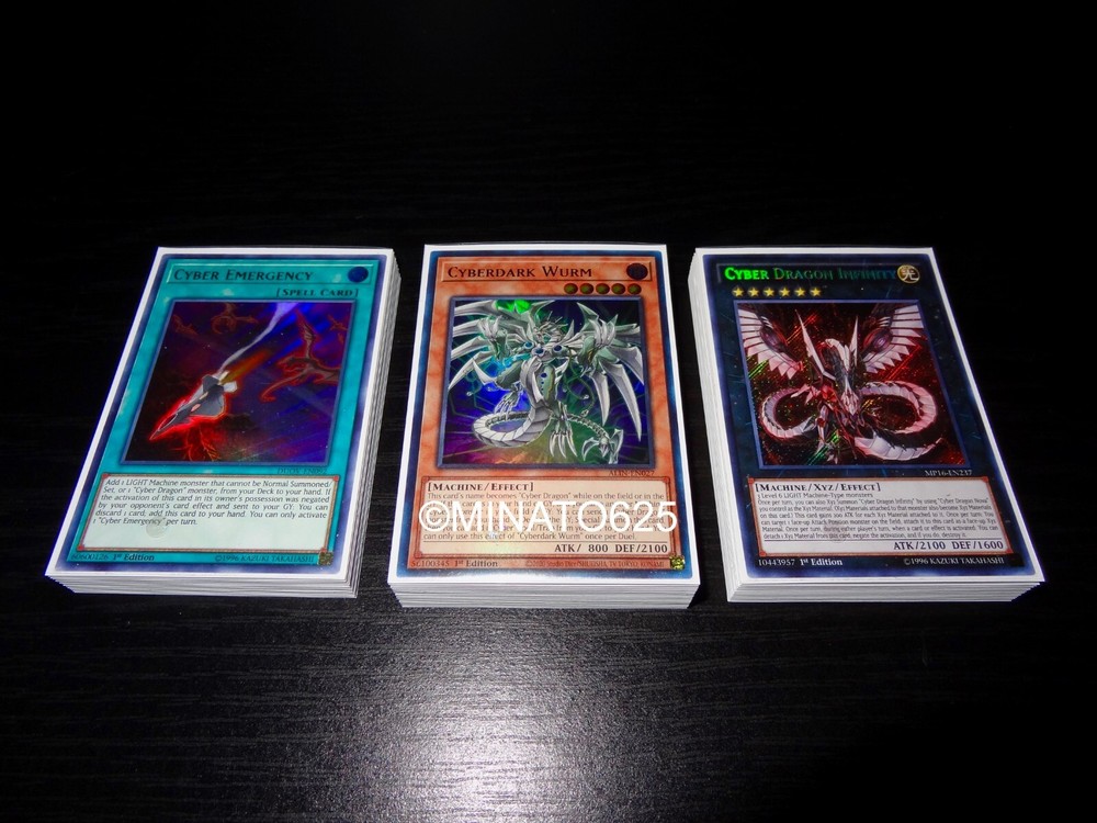 - Item for sale is a Complete 40 Card Cyber Dragon Deck - Ultra Pro sleeves + deck box included - Please leave a checkout note or message me your color choices (randomly chosen otherwise) 40 CARD CYBER DRAGON DECK: Extra Deck Cards (15): 1x Cyber Dragon Infinity (Secret Rare) 1x Cyber Dragon Nova 1x Super Starslayer TY-PHON - Sky Crisis (Ultra Rare) 2x Chimeratech Rampage Dragon (Super Rare) 2x Chimeratech Megafleet Dragon (Ultra Rare) 2x Chimeratech Fortress Dragon (Ultra Rare) 1x Cyber End Dragon (Ultra Rare) 1x Cyber Dragon Sieger 1x Heosvarog the Mechanical Dawn (Super Rare) 1x Clockwork Knight (Ultra Rare) 1x Barricadeborg Blocker 1x Salamangreat Almiraj Monster Cards (22): 3x Cyber Dragon Core (Ultra Rare) 3x Cyber Dragon Herz (Super Rare) 3x Cyber Dragon (Ultra Rare) 3x Cyber Jormungardr 3x Cyber Dragon Nachster 1x Cyberdark Chimera (Ultra Rare) 1x Cyberdark Wurm (Ultra Rare) 3x Cyberdark Claw 1x Therion "King" Regulus (Secret Rare) 1x Jizukiru, the Star Destroying Kaiju Spell Cards (17): 3x Cyberdark Realm (Ultra Rare) 3x Cyber Emergency (Super Rare) 3x Clockwork Night (Ultra Rare) 1x Cyberload Fusion (Ultra Rare) 1x Cyber Repair Plant (Ultra Rare) 3x Machine Duplication 1x Overload Fusion 1x Power Bond 1x Called by the Grave Trap Cards (1): 1x Cybernetic Overflow (Ultra Rare) Shipping - All orders will be shipped with bubble mailer and a protective case. - All Orders will be shipped off within 1 day of purchase - Orders placed on Saturday and Sunday will be shipped off the following Monday. - All orders will be shipped with Free First Class Shipping (3-5 days) + Tracking! - Priority Mail (1-3 days) and Priority Mail Express (1-2 days) are available as well, shipping price will vary depending on your destination. - I ship to both Domestic (U.S.) and International destinations! Payment - Please pay within 3 days of your order to avoid an Unpaid Item Case. This just helps me run things smoothly for other bidders/buyers and myself. Will appreciate if you please leave feedback when you receive your item, and I will leave feedback as well. Contact me if anything is wrong with your order so I can have a chance to fix the issue- Your satisfaction is most important! Thank You! - If you have any questions please do not hesitate to contact me and I will respond as soon as possible. Thank you for taking a look. Have a Great Day!