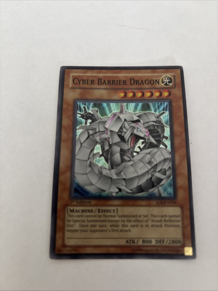 Actual picture of front and back of card. Shipping address 0.50 for each additional card for shipping purchased in one time . Elevate your Yu-Gi-Oh! TCG collection with the Cyber Barrier Dragon, a formidable addition as a Super Rare 1st Edition card. Its presence in your deck can turn the tide of battle, providing both strategic play and a visual appeal that stands out amongst other cards. This dragon-themed card, designated SOI-EN006, is a must-have for enthusiasts and competitive players alike, offering a blend of power and rarity that's hard to pass up. Enhance your game today with this iconic piece from the Yu-Gi-Oh! TCG realm.