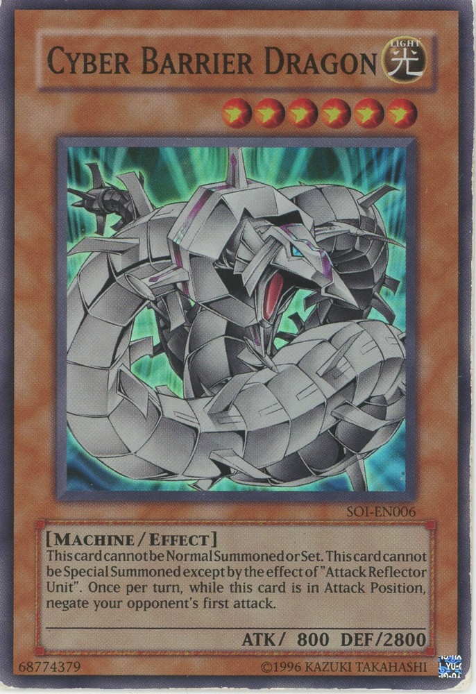 Yugioh Cyber Barrier Dragon SOI-EN006 Super Rare LP You can find more Yu-Gi-Oh cards of all value and rarity in our other listings All cards are in excellent condition unless stated otherwise and the photos are of cards we own but may not be the exact card you receive due to the quantities listed.