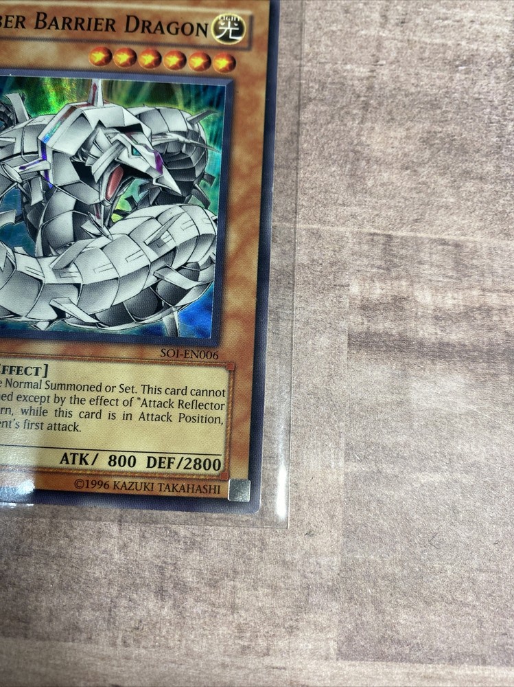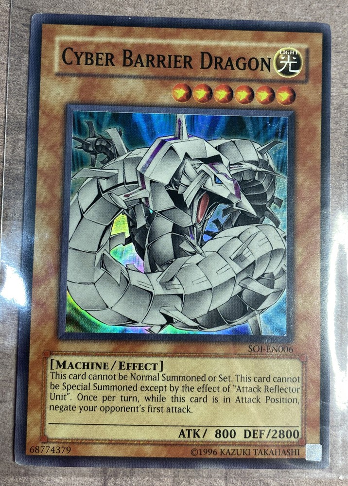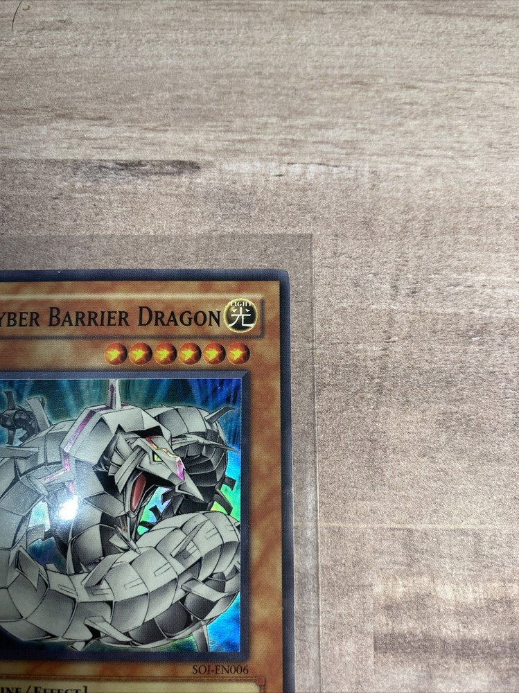 Yugioh Cyber Barrier Dragon SOI-EN006 Super Rare Used. Card is lightly played , some minor scuffs on the corners nothing major, some small scratches on the back nothing major, the card still looks great Item comes as In pictures and will be put in top loader upon shipping No returns
