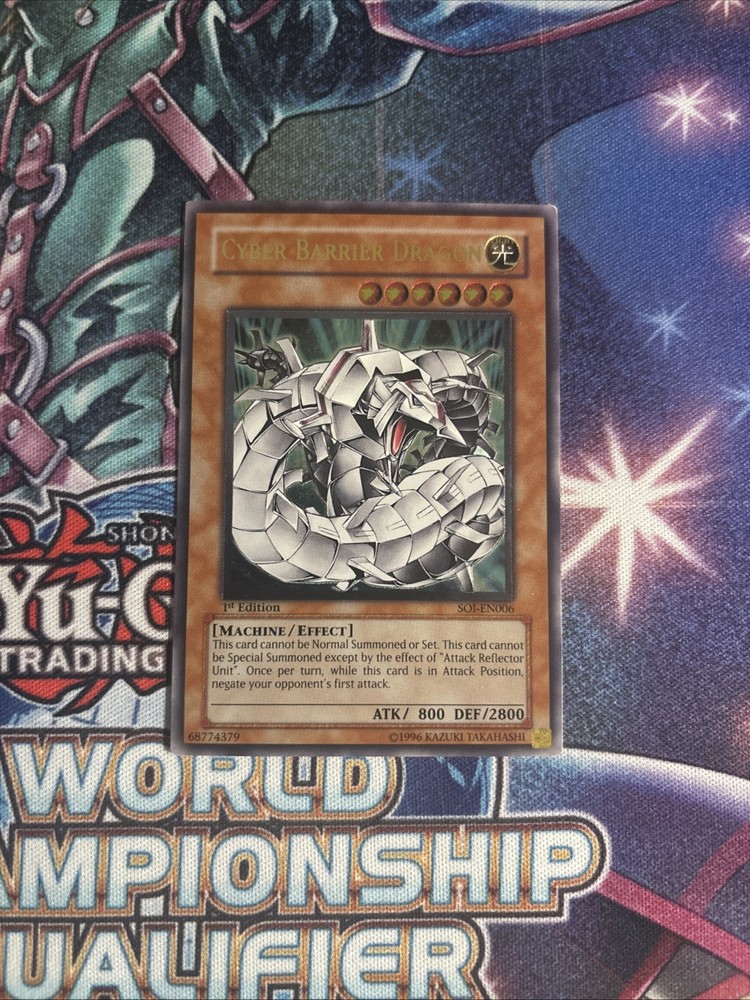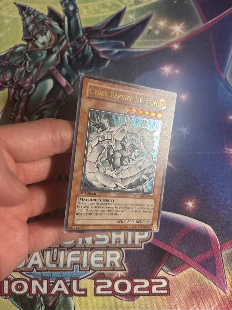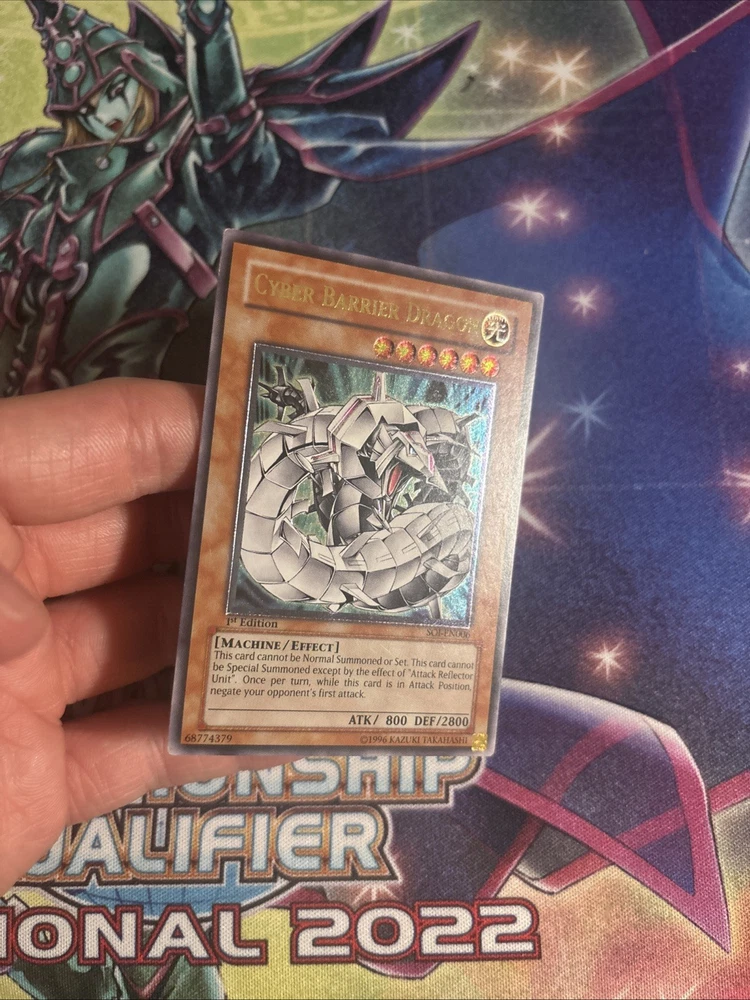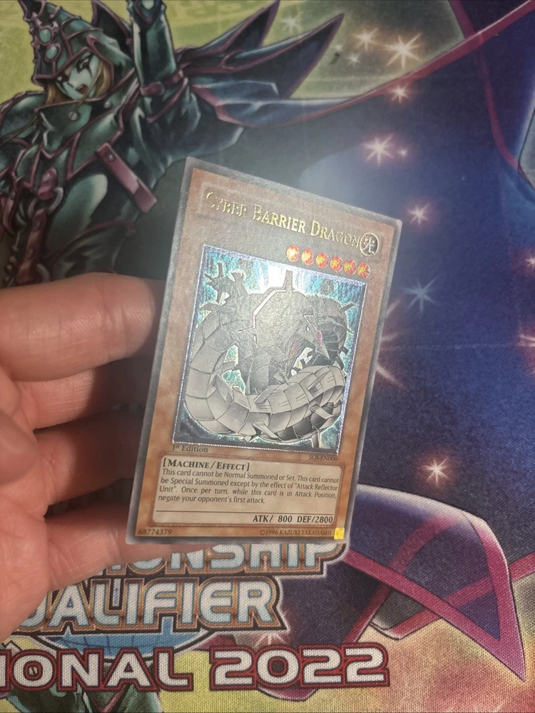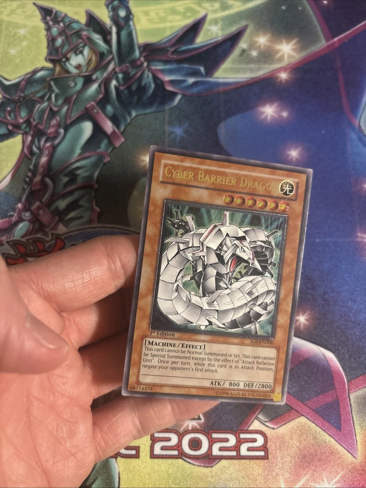 This Cyber Barrier Dragon is an absolute gem for collectors! The Ultimate Rare 1st Edition print looks stunning, and the 5ban Graphics autograph makes it extra special. As a Japanese import from 2006, the card’s crisp artwork and rarity make it a must-have for serious Yu-Gi-Oh! fans. The Angel-type monster detail and Aayla Secura’s presence add even more appeal—definitely a prized piece for any deck or display!
