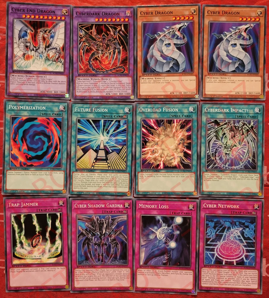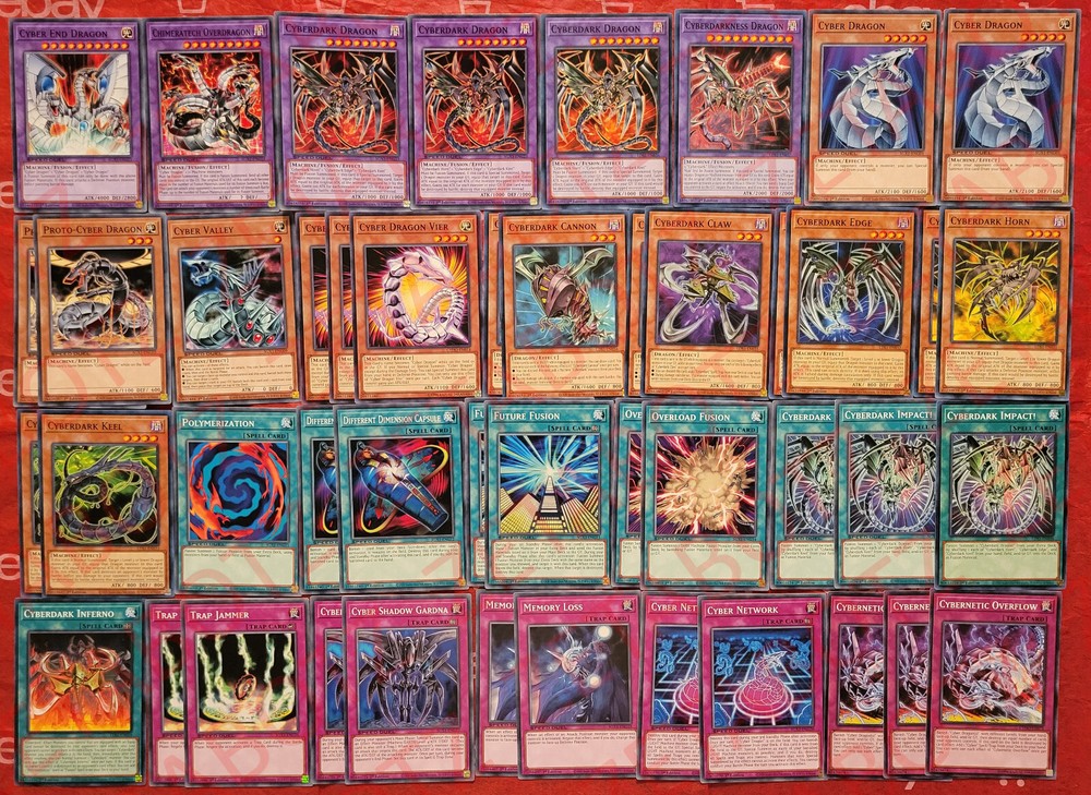 Description You are purchasing one Cyber Cyberdark deck, includes all 46 cards shown in displayed images. See below for the complete deck list. Unless stated otherwise, all cards are mint/near mint condition. Shipping Unless stated otherwise, free shipping. All cards are shipped in a bubble mailer. All items are shipped within 24 hours (1 business day). Weekends do not count as business days. All orders made on Fridays after 8AM EST and weekends will be shipped on the following Monday. International Shipping Only ship to eligible countries under the GSP (Global Shipping Program). Buyers are responsible for all international shipping fees. For more information, go to this link [http://pages.ebay.com/help/buy/shipping-globally.html] Returns (DOES NOT APPLY TO OPENED FACTORY SEALED PRODUCTS) 14 days money back, buyer pays return shipping, 20% restocking fee will be charged Monsters:18 2 Cyber Dragon 2 Proto-Cyber Dragon 1 Cyber Valley 3 Cyber Dragon Vier 2 Cyberdark Cannon 2 Cyberdark Claw 2 Cyberdark Edge 2 Cyberdark Horn 2 Cyberdark Keel Spells:11 1 Polymerization 2 Different Dimension Capsule 2 Future Fusion 2 Overload Fusion 3 Cyberdark Impact! 1 Cyberdark Inferno Traps:11 2 Trap Jammer 2 Cyber Shadow Gardna 2 Memory Loss 2 Cyber Network 3 Cybernetic Overflow Extra:6 1 Cyber End Dragon 1 Chimeratech Overdragon 3 Cyberdark Dragon 1 Cyberdarkness Dragon