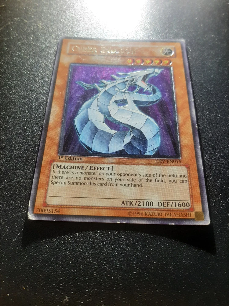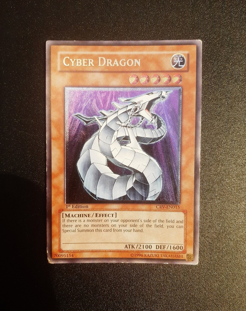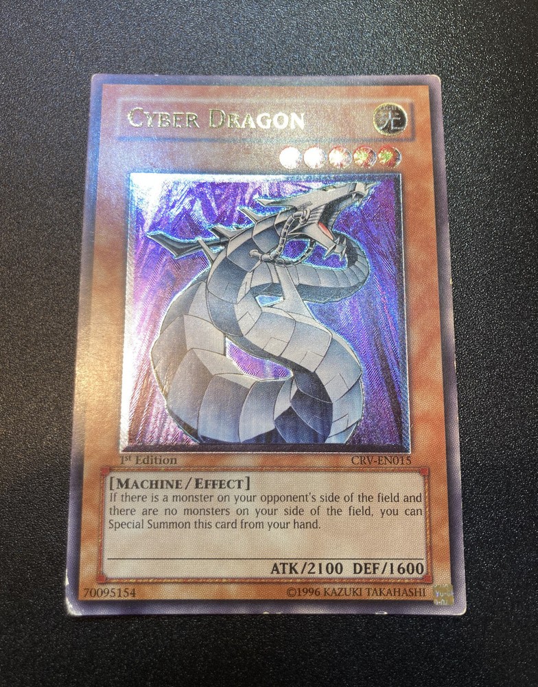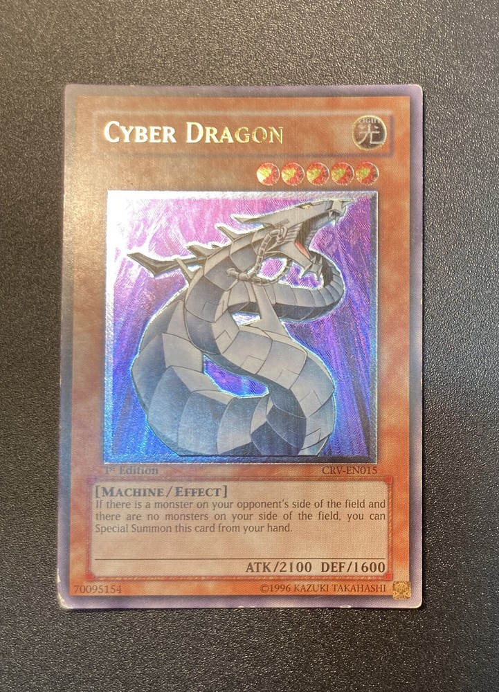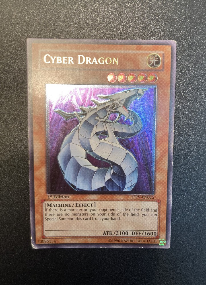1x Yugioh Cyber Dragon CRV-EN015 1st Edition Ultimate Rare European English This is a beautiful card printed in 2005, the European 1st edition has an amazing colourful shiny holographic finish This card has been played with and is not in perfect condition, the bottom left corner is damaged whitened and creased especially on the back, the other corners/edges of the card have marks/wear and whitening, the surface of the card has many small marks and wear as expected for a vintage card of this age/condition, the back of the card has the same and also has a long horizontal line mark around 1 inch above the bottom of the card and similar markings above towards the centre of the back, this is a very old card and has many marks/whitening but the holographic shine is beautiful >> Please view all photos carefully to see the condition and everything mentioned above << I have tried my best to show the condition of this card so please see the photos, if you want any more photos please message me and I will take any you need Card will be sent extremely well protected, double sleeved inside a toploader and team bag, securely packed inside bubble wrap and cardboard Please feel free to send any offer or ask any questions Thank you!