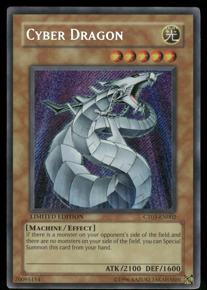 Cyber Dragon CT03-EN002 Yugioh! 2006 Collectors Tin Secret Rare Yugioh! TCG. If multiple cards are listed, you may not receive the exact one in the photos. All copies are in the same condition. Condition is as shown. Please feel free ask if you'd like to see more photos! All card orders packaged with care using a penny sleeve, top loader and a team bag. Singles up to $20 will be shipped in a PWE, $20+ will be shipped in a Bubble Mailer, anything fragile/sealed (depending on the product) will be shipped in a box. All orders are shipped out within 24 hours.