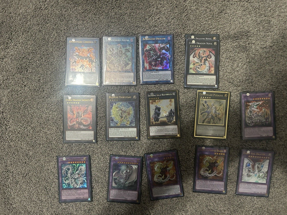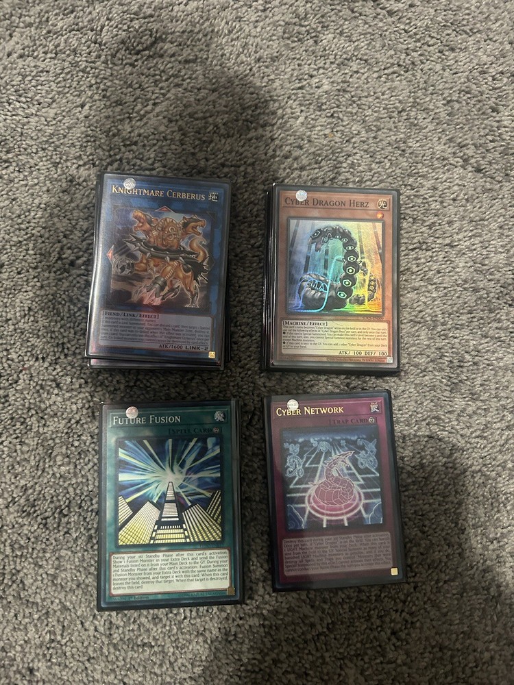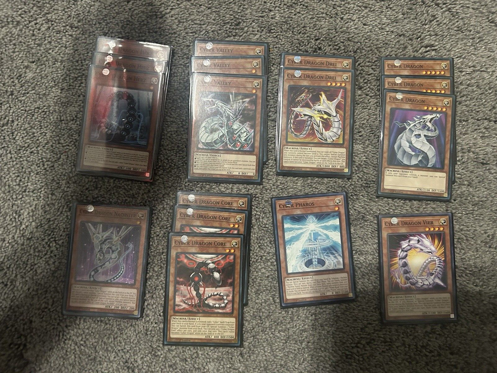 77 cards to with: A deck box 22 Bonus cards 4 Trap cards 15 Extra deck cards 17 Monsters 19 spells sleeves...