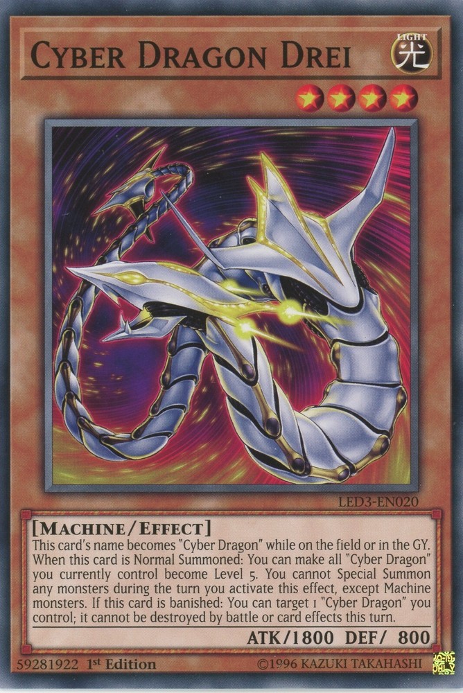 Yugioh Cyber Dragon Drei LED3-EN020 Common Mint Condition x3 You can find more Yu-Gi-Oh cards of all value and rarity in our other listings All cards are in excellent condition unless stated otherwise and the photos are of cards we own but may not be the exact card you receive due to the quantities listed.