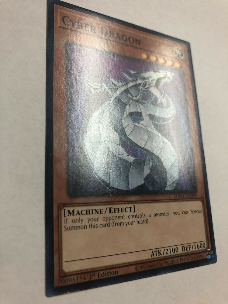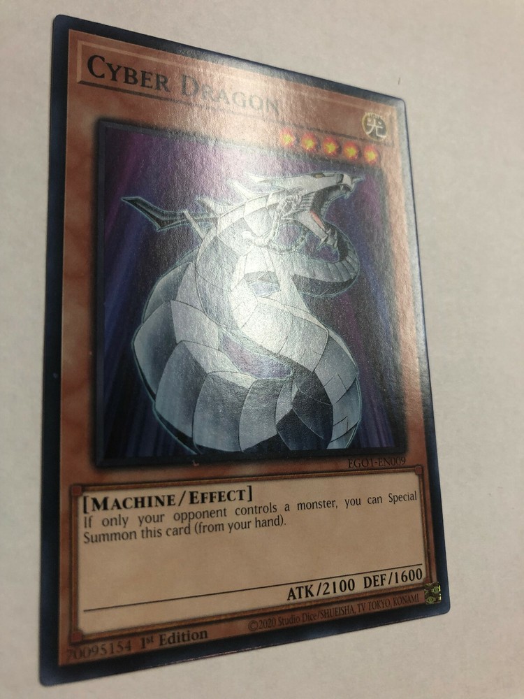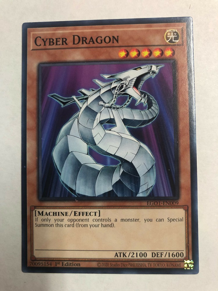 Yugioh Cyber Dragon EGO1-EN009 1st Edition Mint(Pack Fresh!) This card was never played because it is "Mint" Brand New! (Pack Fresh!) Check out the Pics! Add this to your collection today! If you wish additional pictures just let me know and I can send. I've tried to get the best angles purposely showing glare so that you can ensure there are no creases or defects. I ship the card Economy Style in a standard #10 Legal Security(No see through) Envelope. Card will be in a Protective Sleeve and then in a Toploader and then in a TeamBag. I Ship with USPS. Enjoy and Thanks! Jimbo YU-BX1-R01-L