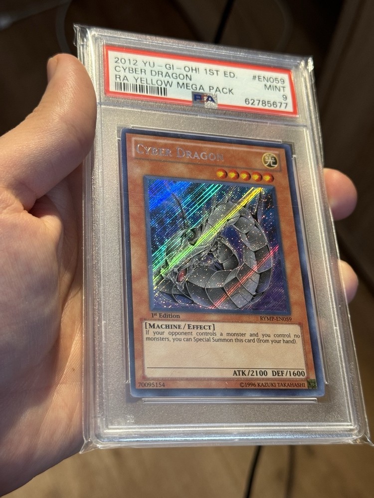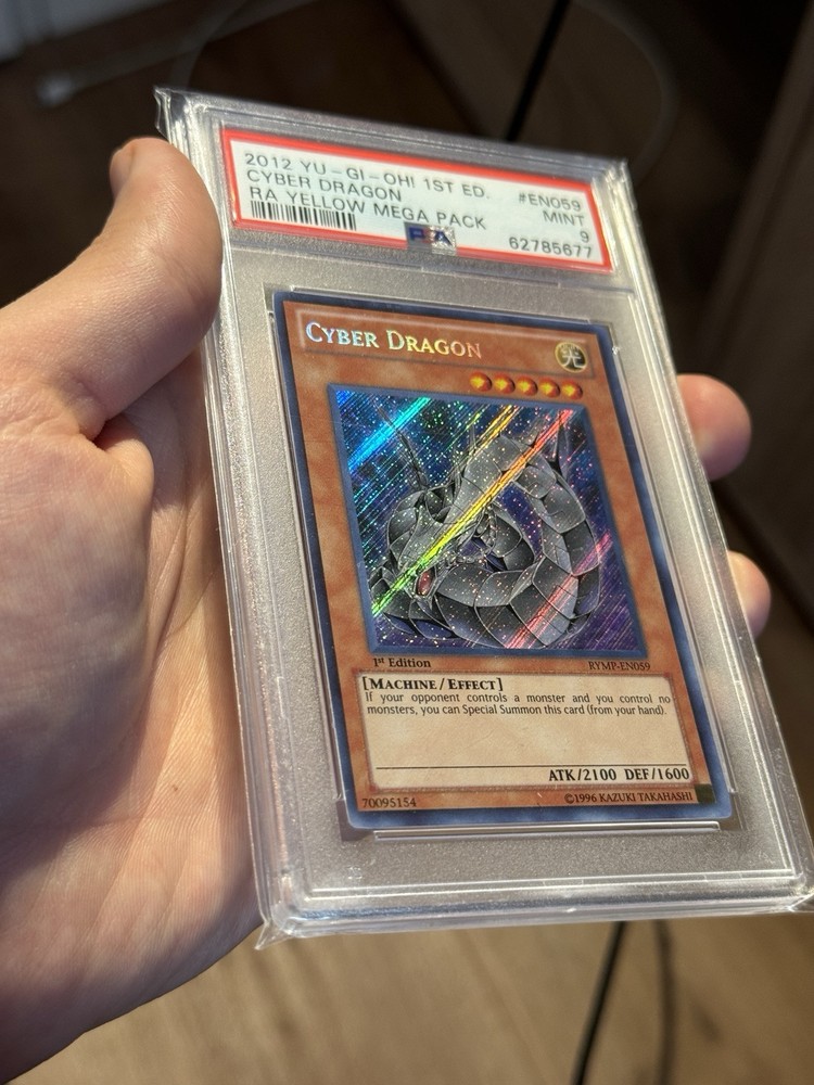This Cyber Dragon Secret Rare in PSA 9 condition is a must-have for collectors! The card looks even better in person—crisp holofoil, perfect centering, and flawless edges. Super fast shipping and securely packaged. Seller was very responsive and helpful. Highly recommend for Yu-Gi-Oh! enthusiasts!