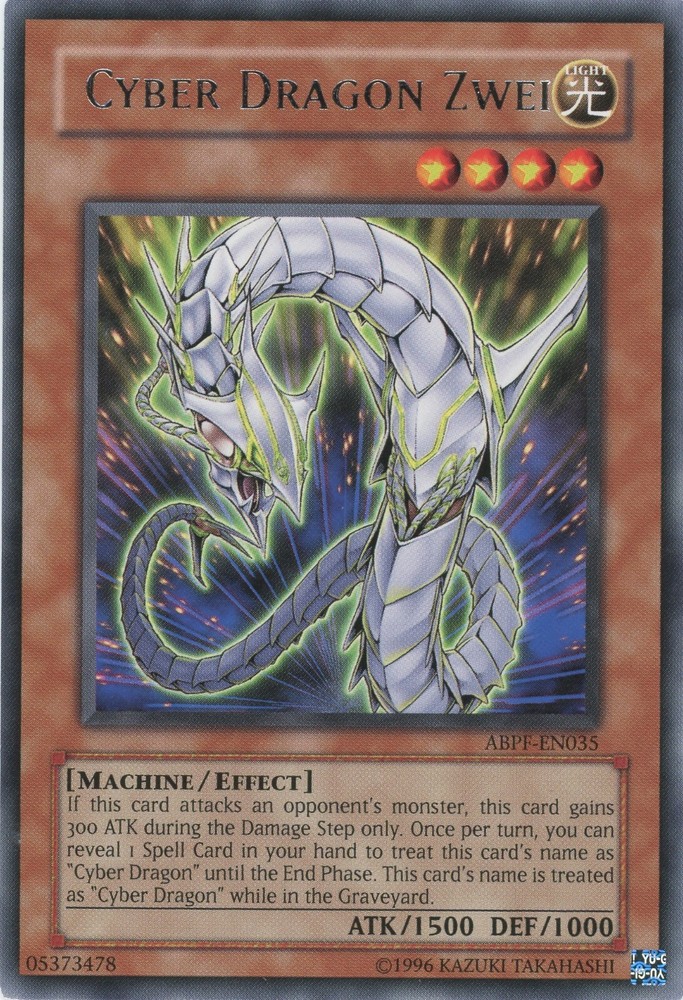 Yugioh Cyber Dragon Zwei ABPF-EN035 Rare MP You can find more Yu-Gi-Oh cards of all value and rarity in our other listings All cards are in excellent condition unless stated otherwise and the photos are of cards we own but may not be the exact card you receive due to the quantities listed.