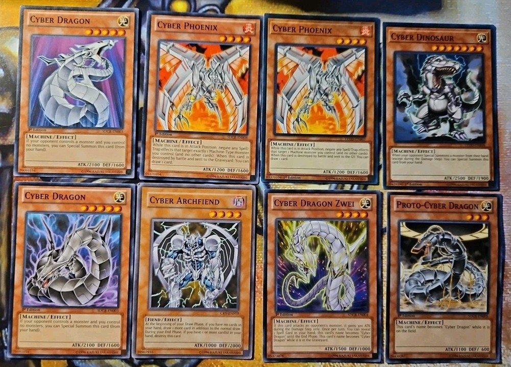 The product is a lot of Yu-Gi-Oh! TCG cards featuring the Cyber Dragon archetype. These cards are likely to include various Cyber Dragon monsters and support cards that revolve around summoning and supporting these powerful machine-type monsters in the game. As a part of a mixed card lot, this collection may offer players the opportunity to enhance their Cyber Dragon deck or explore new strategies within the Yu-Gi-Oh! TCG using these specific cards.