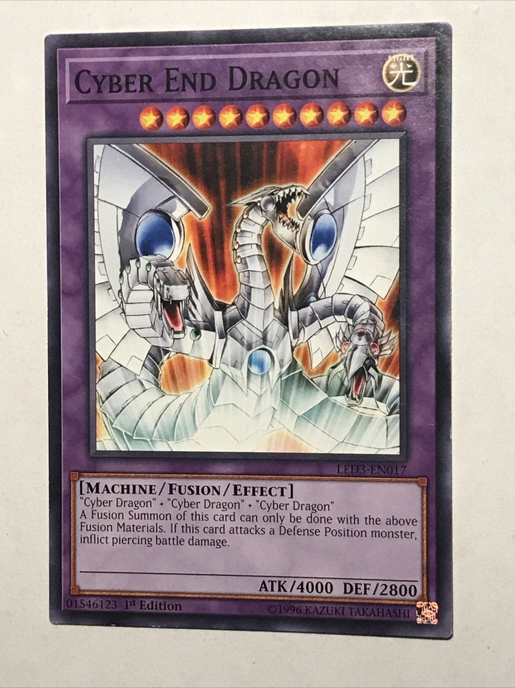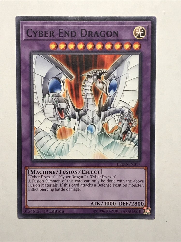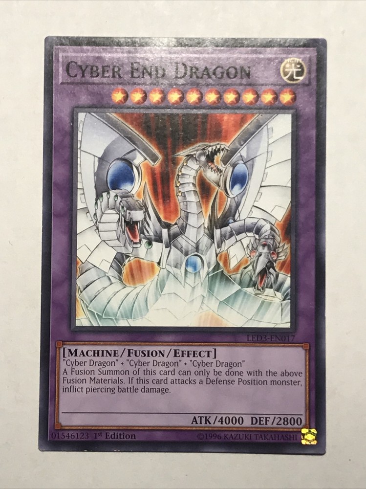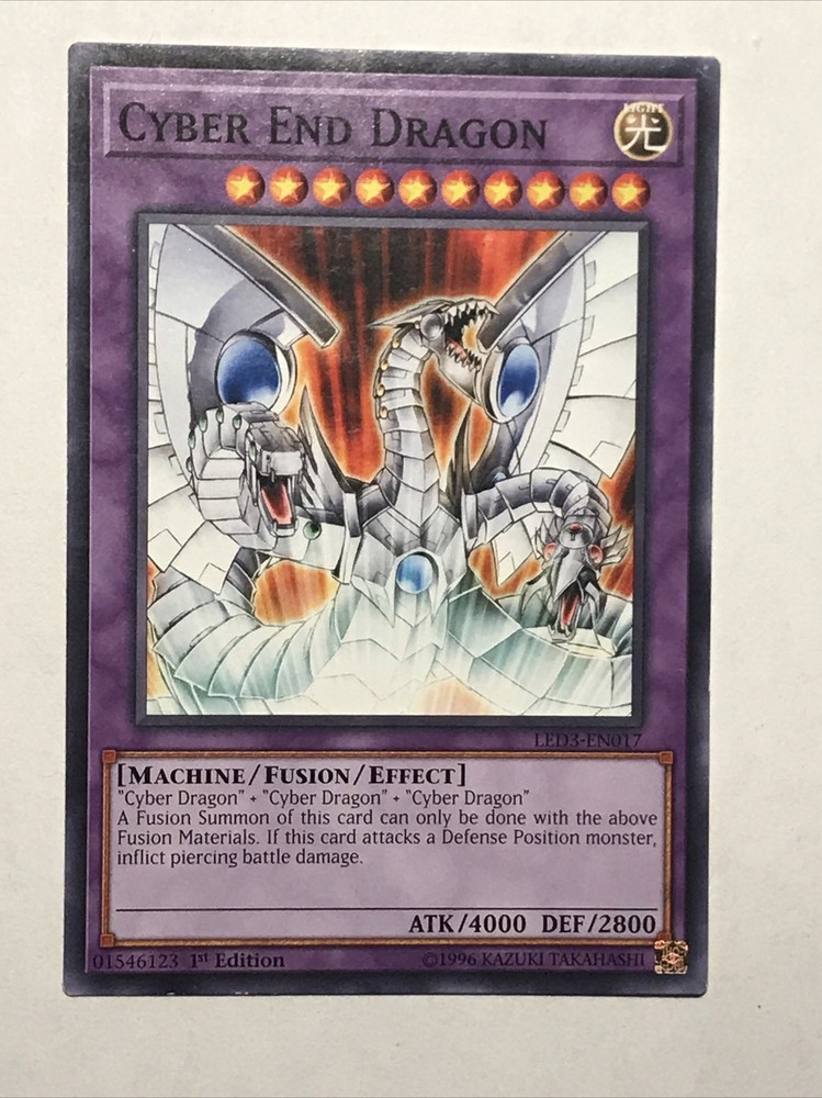 This Yu-Gi-Oh! TCG card features Cyber End Dragon, a powerful Machine-type creature that is perfect for any deck. With its Light color and Fusion stage, it is an essential addition to any collection. This card is from the Legendary Duelists: White Dragon Abyss set and is a Common 1st Edition with card number LED3-EN017. The finish is Regular and it also has the feature of being machine-specialized. It is autographed-free and manufactured by Konami.
